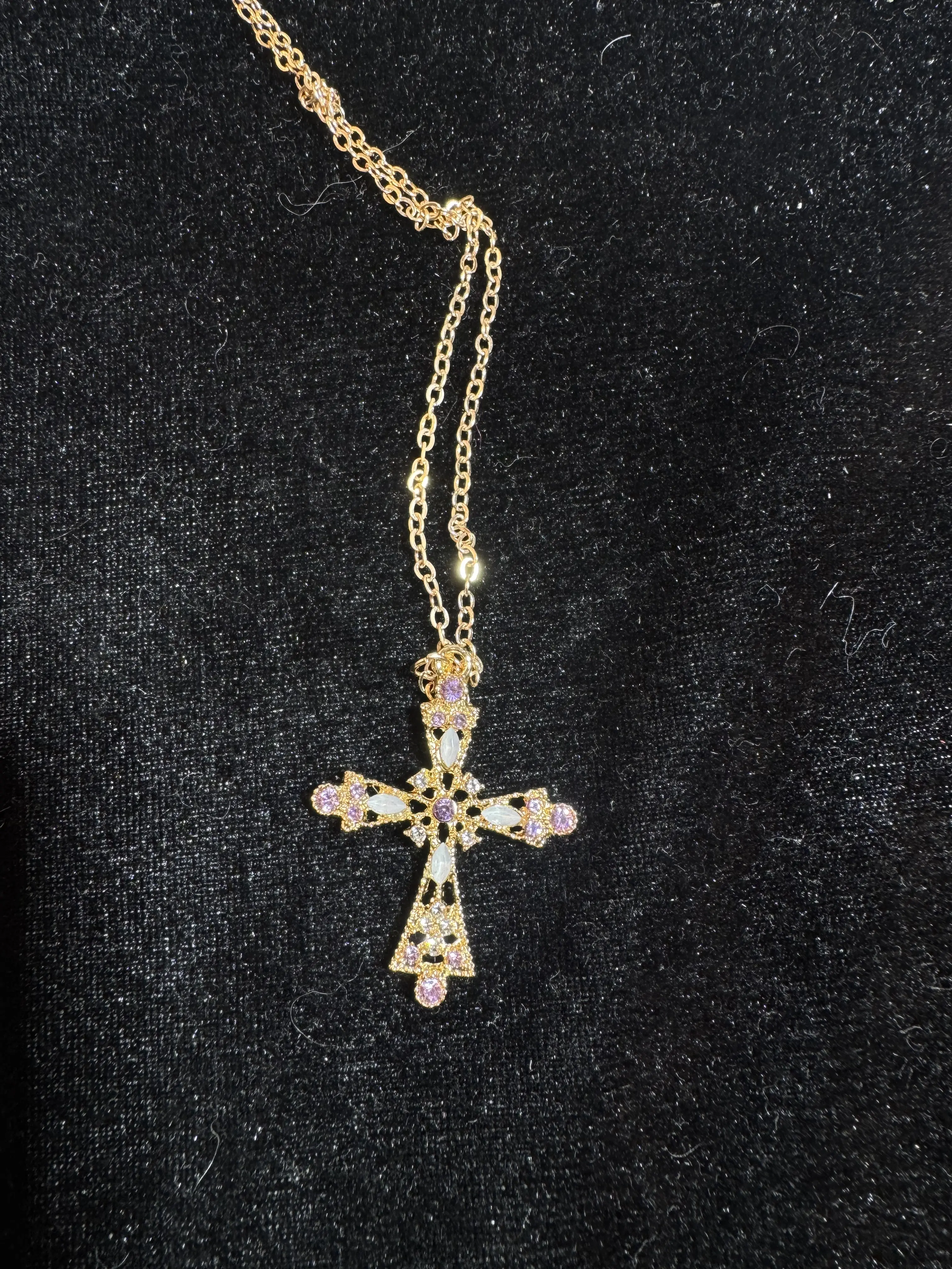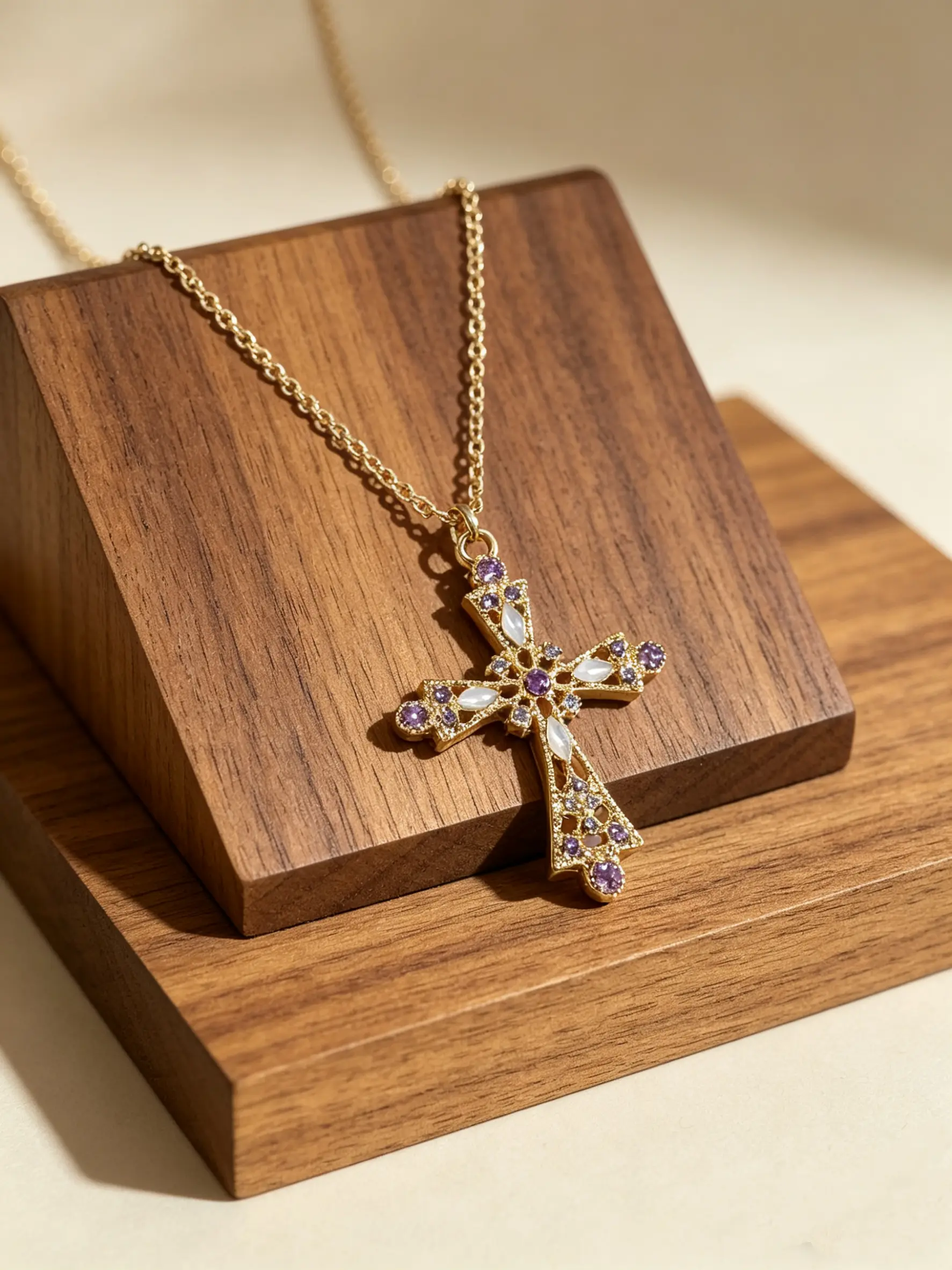 The showstopping cross pendant is a masterclass in artisanal design: a warm, polished gold-tone framework is intricately filigreed with delicate, lace-like metalwork, creating a vintage-inspired texture that feels both romantic and regal. At its heart, a rich amethyst-hued central stone anchors the design, surrounded by alternating marquise-cut opalescent white stones and round-cut amethyst crystals, each meticulously set to catch and reflect light with every movement. Tiny sparkling accent stones fill every detail, adding a subtle, continuous glow that elevates the entire piece.