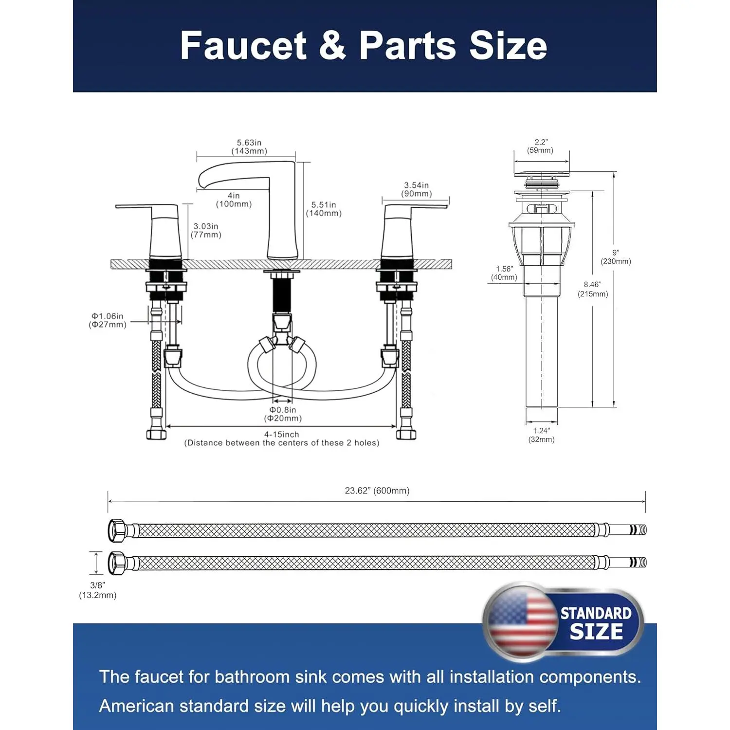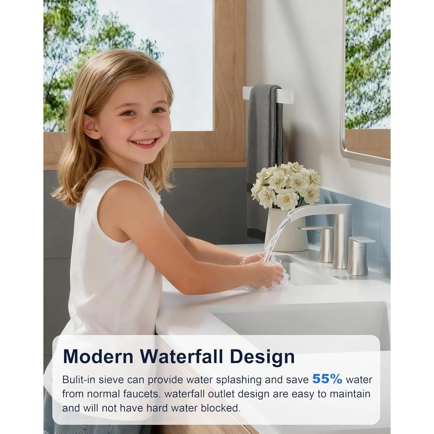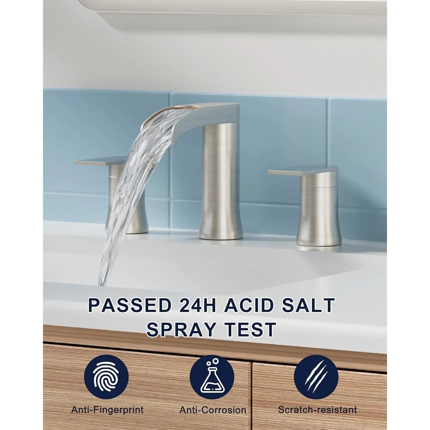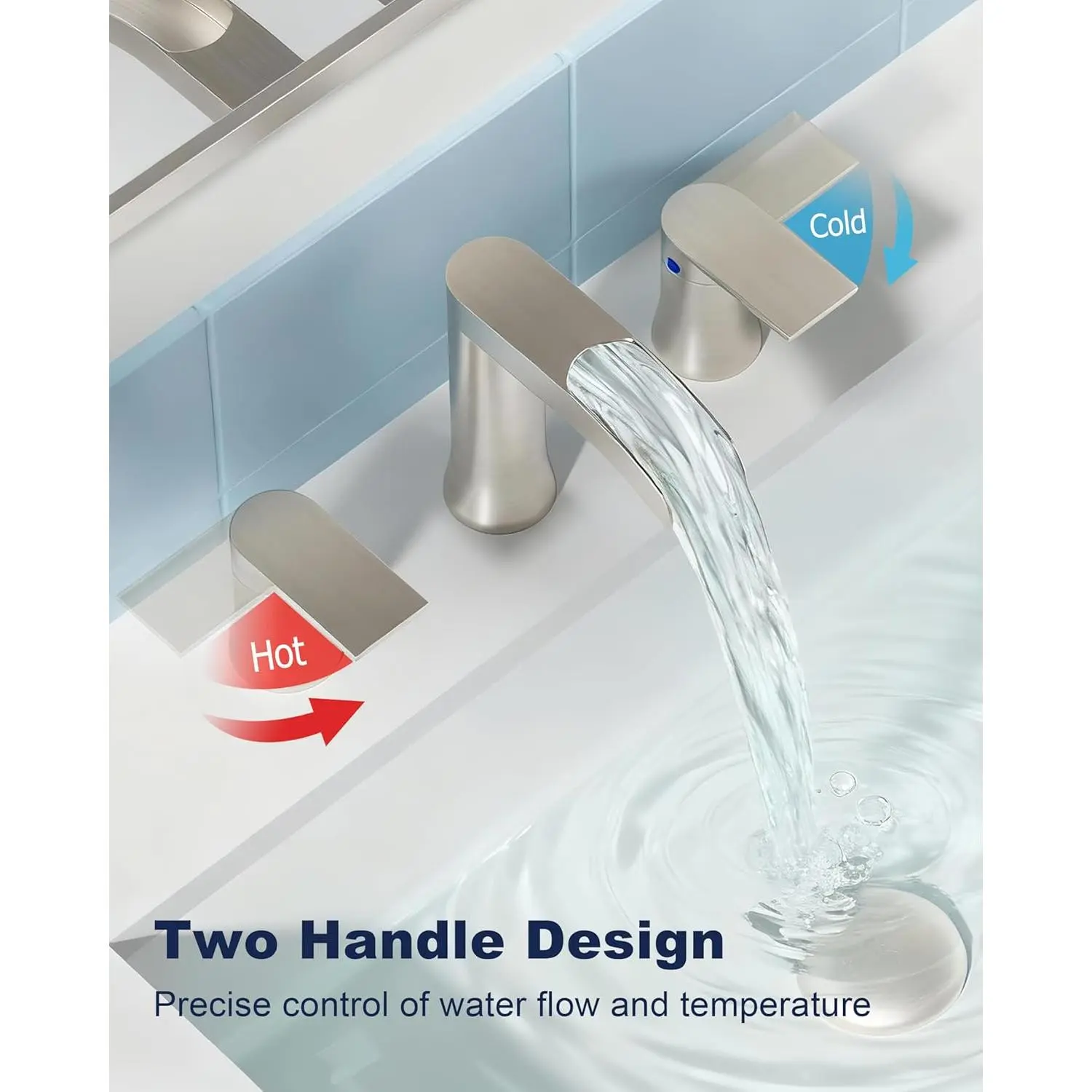 Pioneering Waterfall Faucet - Our innovative design delivers asmoother, more consistent waterfall flow withvirtually no splashing andsignificantly reduced noise-creating a serene, spa-like experience.Compared to competitive models, theSREEZNX waterfall faucets achieves over 40% water savings while maintaining the full, luxurious waterfall effect.Enjoy eco-friendly performance bathroom faucets without compromising on style or tranquility.Built To Last - SREEZNX brushed nickel bathroom faucets is crafted from premium304 stainless steel with amulti-layer nano-coating for enhanced durability.Thebathroom faucets high-precision surface treatment ensuressuperior corrosion resistance, while the smooth, non-porous finish makes cleaning a breeze-helping you maintain aspotless and organized bathroom with minimal effort.Reinforced Core Technology - The SREEZNX 3 hole bathroom faucet features adrip-free copper & ceramic disc cartridge that has undergonerigorous testing - withstanding600,000 cycles of water tightness testing.This ensuressuperior leak-proof performance andconsistent, reliable operation, unaffected by extreme temperatures, sand, rust, or hard water conditions.Durability & Healthier Materials - The SREEZNX 3 hole brushed nickel faucet features 304 lead-free stainless steel hoses for a healthier water experience, with each hose protected by a 23.6" braided, flexible supply line with a copper core to withstand high temperatures and prevent bursting.A built-in rubber ring ensures a leak-proof seal, while the 9/16" threaded connection is designed for standard U.S. plumbing compatibility, offering stability, long-lasting performance, and peace of mind for health-conscious users.Upgraded Pop-up Drain - Features an ABS push-and-seal design, made from premium ABS material to ensure rust-free, durable, and leak-proof performance.This updated drain for waterfall faucets effectively blocks hair and debris from entering the pipeline through the sink's overflow hole.The pop-up drain design for 3-hole bathroom faucets offers easier installation and more convenient operation compared to traditional lift rod drains.Smooth Operation - The 90 degree lever handles feature drip-free ceramic cartridges for effortless flow and precise temperature control, while the waterfall spout design provides ample space.(Spout Height: 5.1 inch| Spout Reach: 6 inch).Effortless 10 Minute Installation - This 8 inch widespread American standard bathroom faucet is designed for quick and easy DIY installation in just 4 simple steps, saving you both time and money by eliminating the need for a plumber.With a mounting hole diameter of 1.14-1.38 inches and a maximum deck thickness of 1.57 inches, it's compatible with most standard.A generous 4-15 inch 3 hole installation range for versatile placement.Flow Rate - Meet CEC standard 1.2 GPM (4.5 L/min) at 60 PSI maximum, with a daily water consumption of 1,728 gallons.For a medium-sized garden (about 1,076 sq ft / 100㎡), this water supply can support 21-32 watering cycles when applying 53-79 gallons (200-300 liters) per session.Versatile Styling - This modern bathroom faucet complements a wide range of decors, making it perfect for bathrooms, powder rooms, RV, lavatories, laundry rooms, farmhouse bathrooms, restrooms, rental properties, travel trailers, and campers.Perfect Service - If you have any questions or issues, please don't hesitate to contact us - we're available 24/7 to provide assistance and ensure your complete satisfaction.