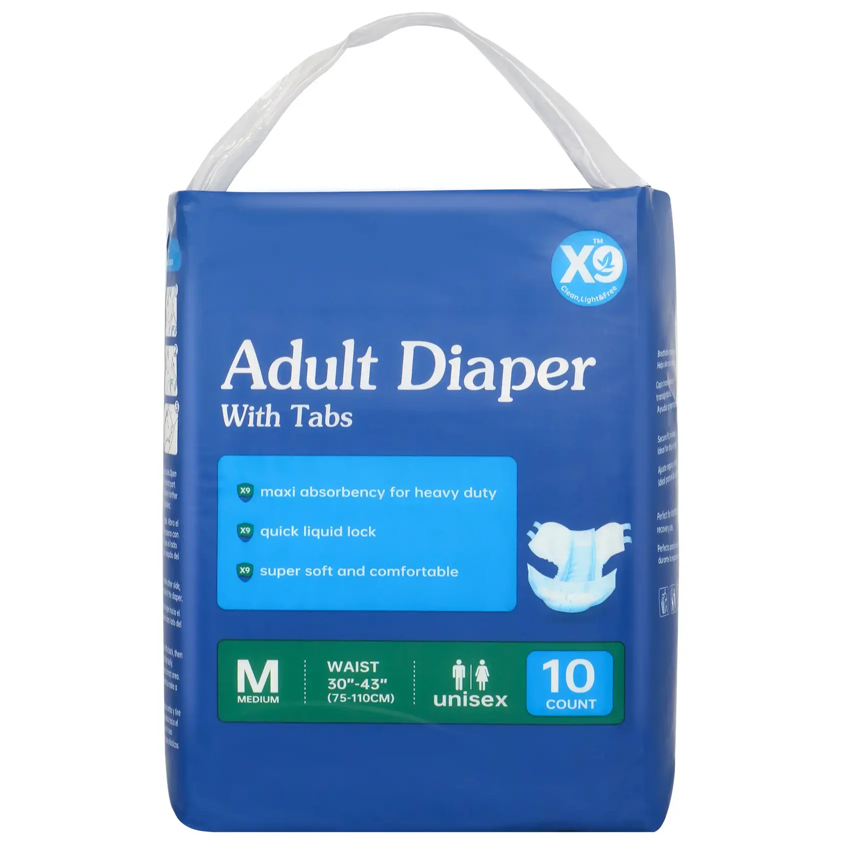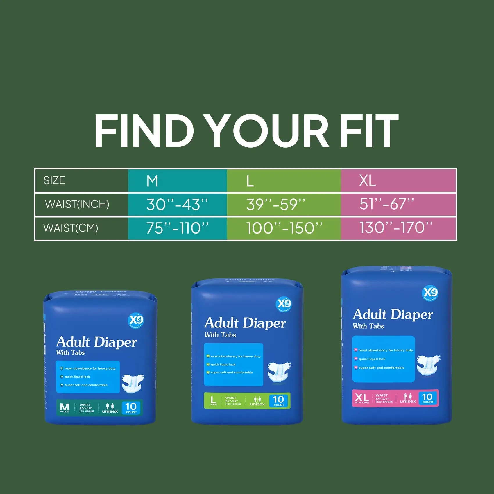 X9 Adult Diapers with Tabs, Heavy Absorbency Incontinence Diapers, Unisex for Men & Women, Quick Liquid Lock, Super Soft, Size M/L/XL, 10 Count Per Pack
