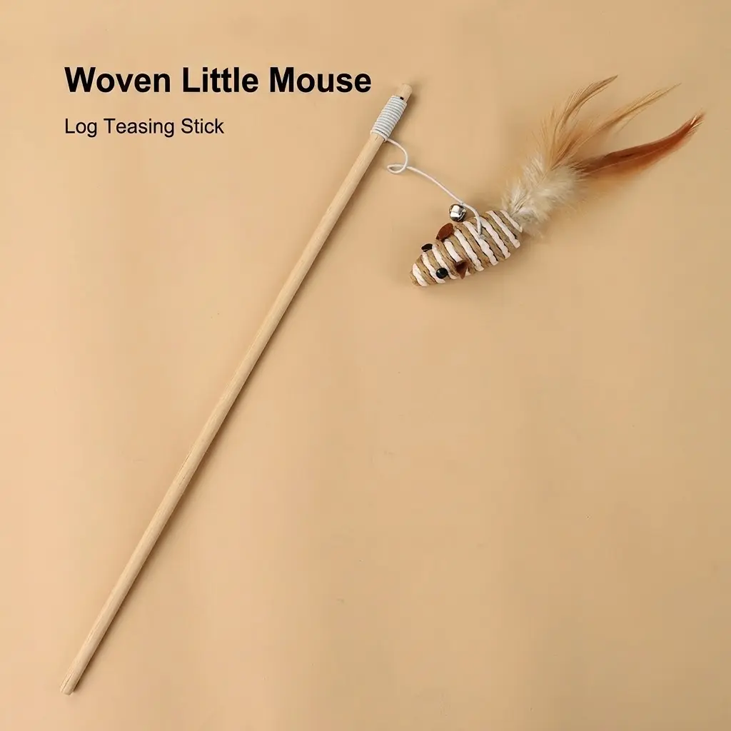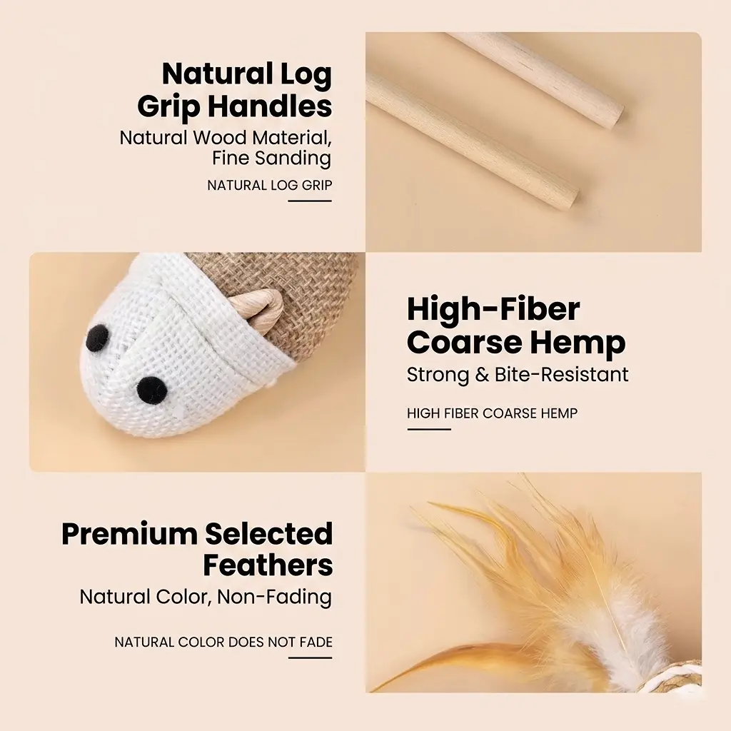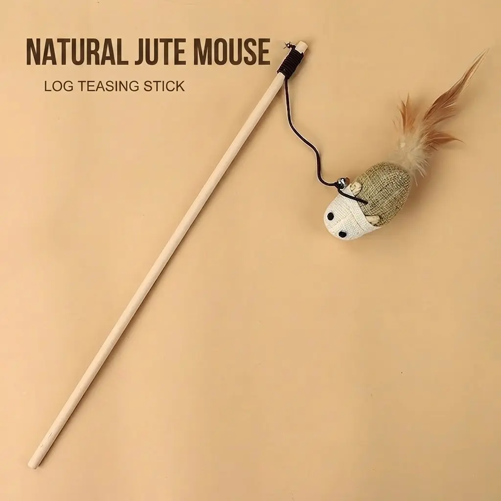 Handcrafted Natural Wood Cat Teaser Wand Toy with Durable Jute Rope Mouse, Real Feathers and Jingle Bell - Interactive Log Teasing Stick for Indoor Cats, Kittens, Exercise and Hunting Play