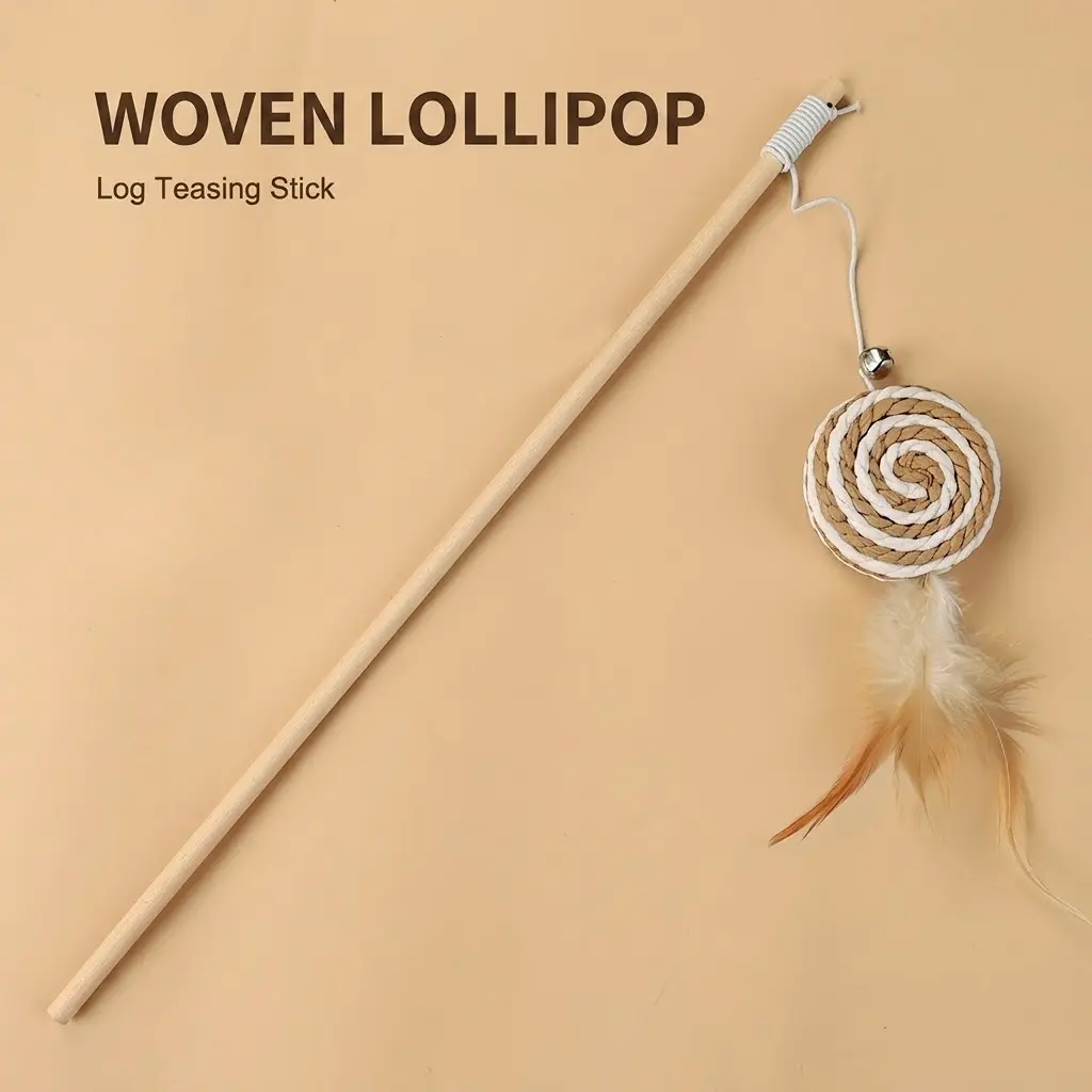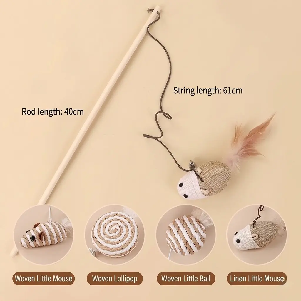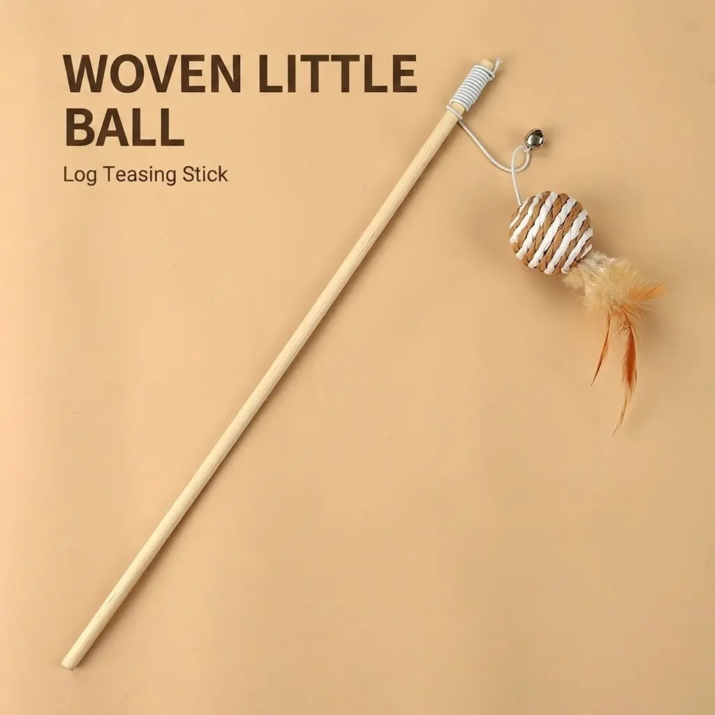 Handcrafted Natural Wood Cat Teaser Wand Toy with Durable Jute Rope Mouse, Real Feathers and Jingle Bell - Interactive Log Teasing Stick for Indoor Cats, Kittens, Exercise and Hunting Play