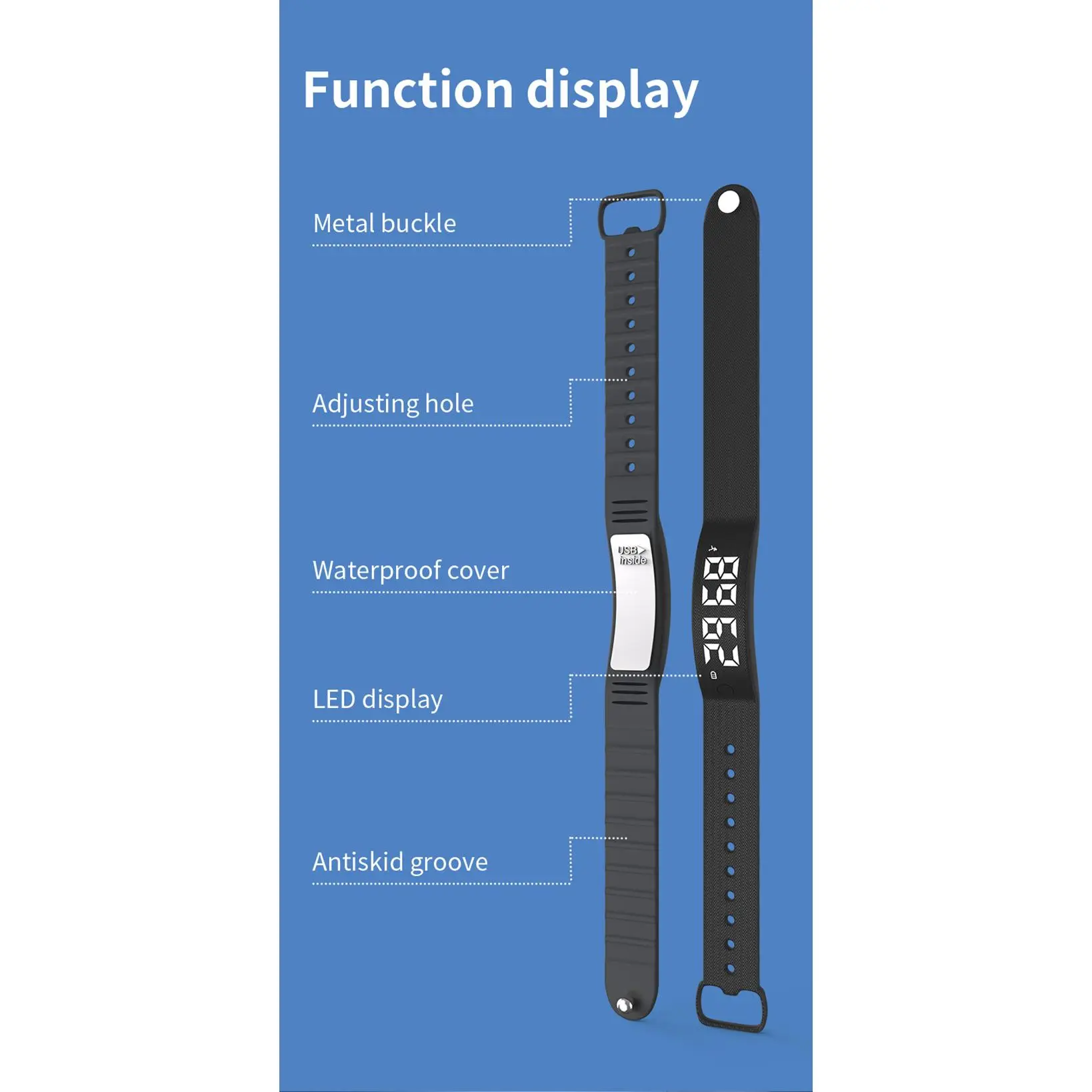 Product parameters: Material: Food-grade environmentally friendly silicone Display screen: LED display screen Charge mode: USB Supply voltage: DC=5V Battery capacity: 50mAh Pedometer: G-sensor Step calculation precision: +-5% Number of step displayed: 39999 steps Weight: 18G Overall dimensions: 215(L)*17(W)*8(H)mm Operation atmospheric pressure:860hPa-1060hPa Product brief introduction: 1.High sensitivity 3D acceleration sensor (seize the small movement, step calculation more accurate) 2.Free transform for the step calculation (humanization design, one-time step calculation, as well as 24 hours step calculation,shift as you wish) 3.Time/date (manual setting for the time/height/weight) 4.calorie,distance (can check the motion informaiton in the bracelet) 5.Motion data memory (Bracelet keeps the motion data for 24 hours,eliminate automatically by zero hour, intelligent and worry-saving) 6.Silent alarm clock (can operate the setting on the bracelet, no complicated handle on the App) 7.Timekeeping function (Use the bracelet to do the timekeeping, the motion/distance/time can be clearly seen) 8.Bracelet is with the USB interface (Can be used once charged, very convenient) 9.Li-polymer charging battery (Li-polymer lithium battery is safer, longer life span)