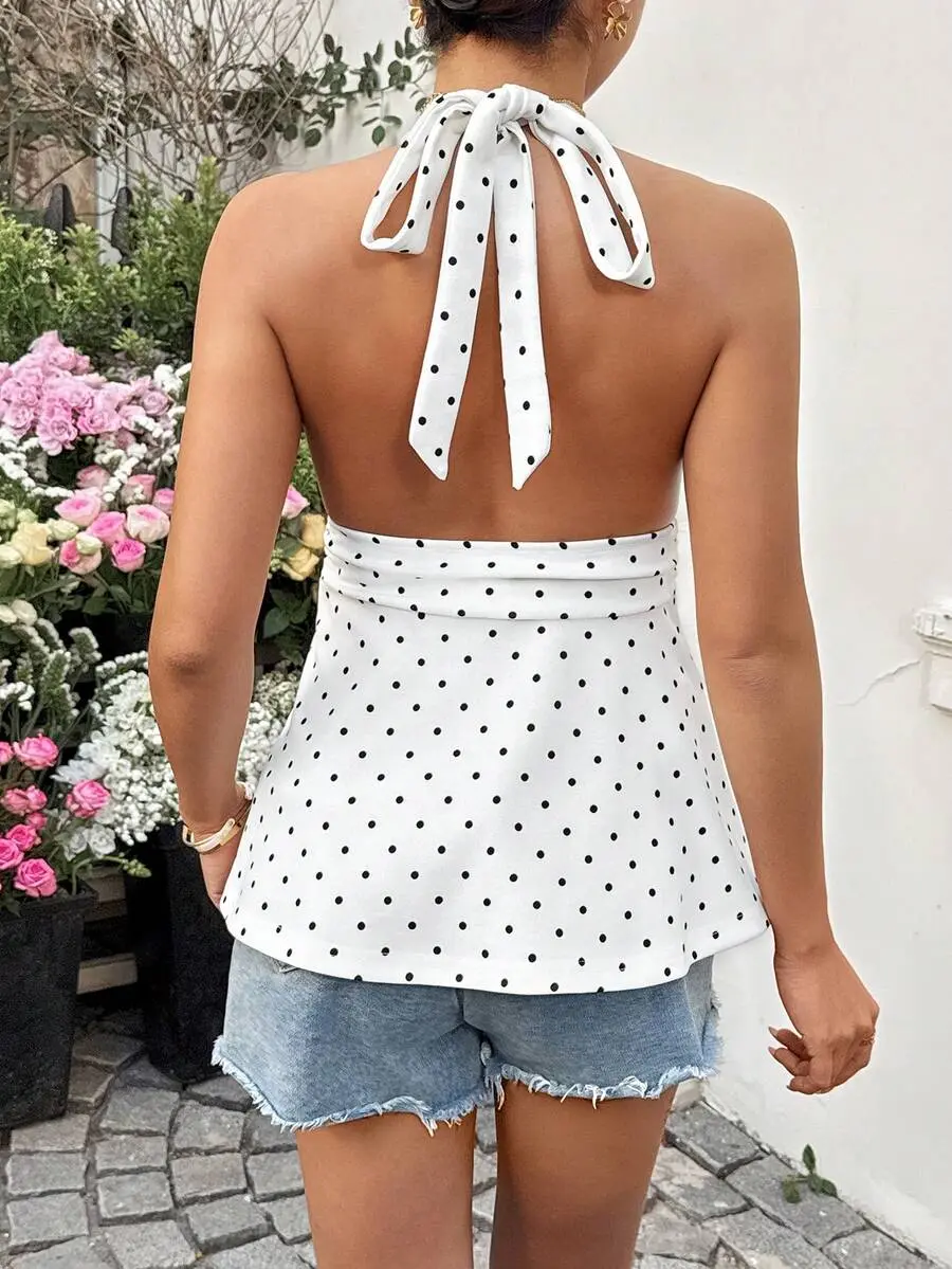 ELARA White Polka Dot Print Backless Halter Top, Sleeveless, Suitable For Pregnant Women, Perfect For Summer Casual Vacations.