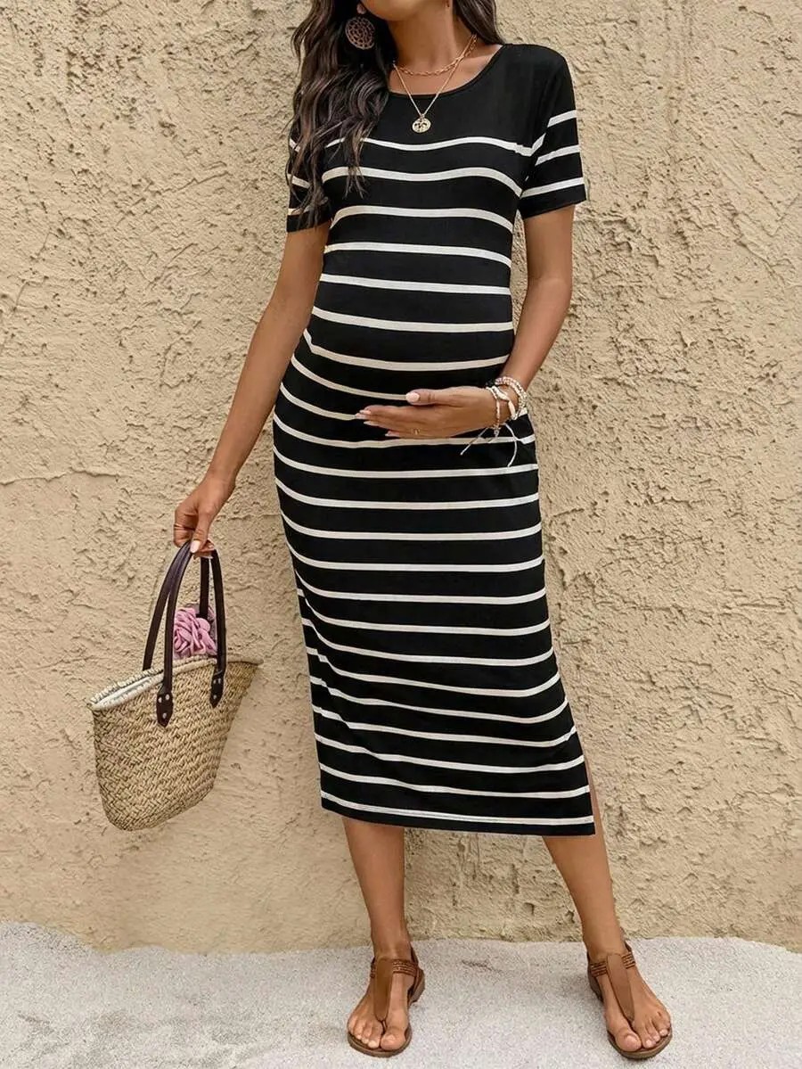 JOYCEE Pregnant Women's Round Neck Short Sleeve Slit Striped Casual Summer Versatile Dress