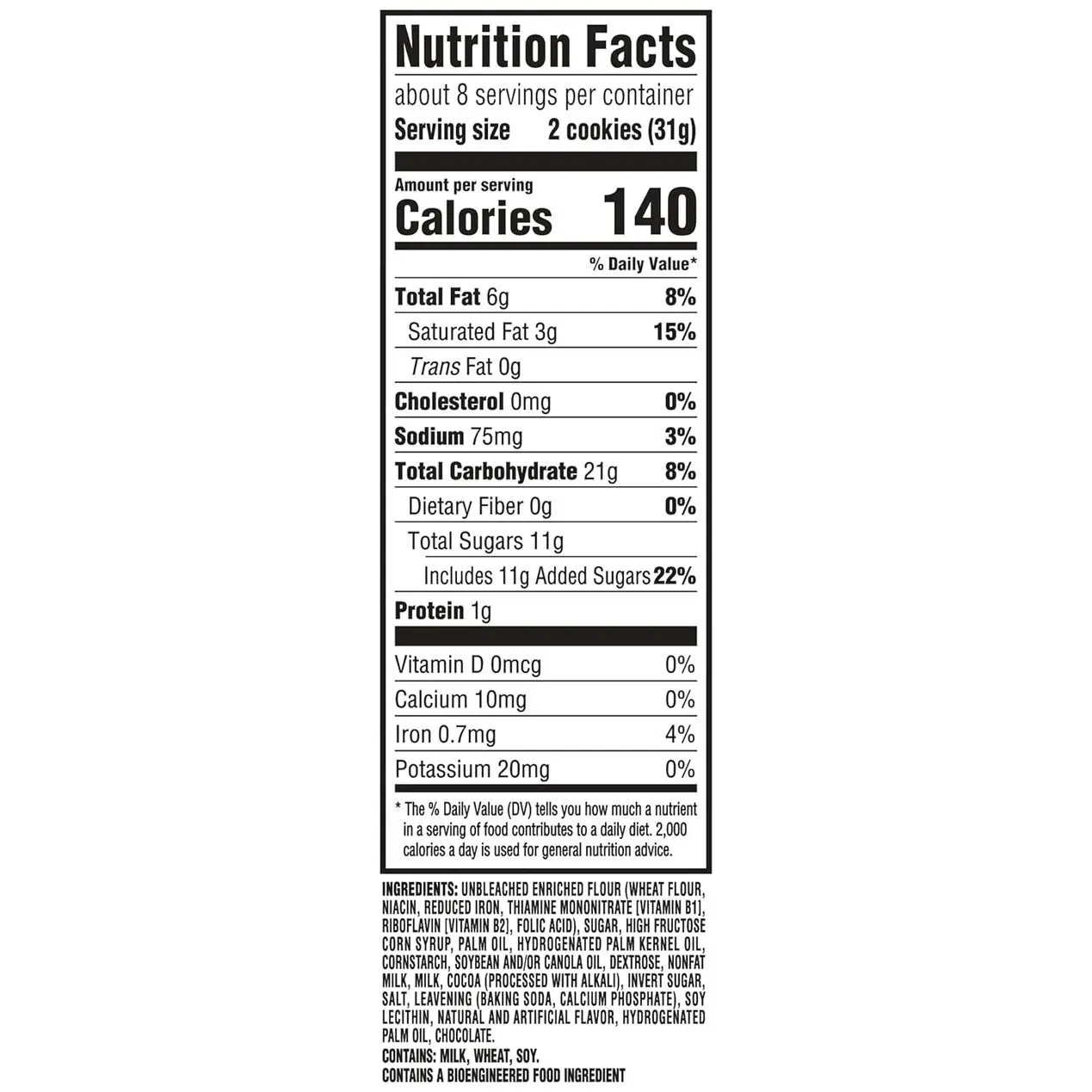 UNBLEACHED ENRICHED FLOUR (WHEAT FLOUR, NIACIN, REDUCED IRON, THIAMINE MONONITRATE [VITAMIN B1], RIBOFLAVIN [VITAMIN B2], FOLIC ACID), SUGAR, HIGH FRUCTOSE CORN SYRUP, PALM OIL, HYDROGENATED PALM KERNEL OIL, CORNSTARCH, SOYBEAN AND/OR CANOLA OIL, DEXTROSE, NONFAT MILK, MILK, COCOA (PROCESSED WITH ALKALI), INVERT SUGAR, SALT, LEAVENING (BAKING SODA, CALCIUM PHOSPHATE), SOY LECITHIN, NATURAL AND ARTIFICIAL FLAVOR, HYDROGENATED PALM OIL, CHOCOLATE. CONTAINS: MILK, WHEAT, SOY.
