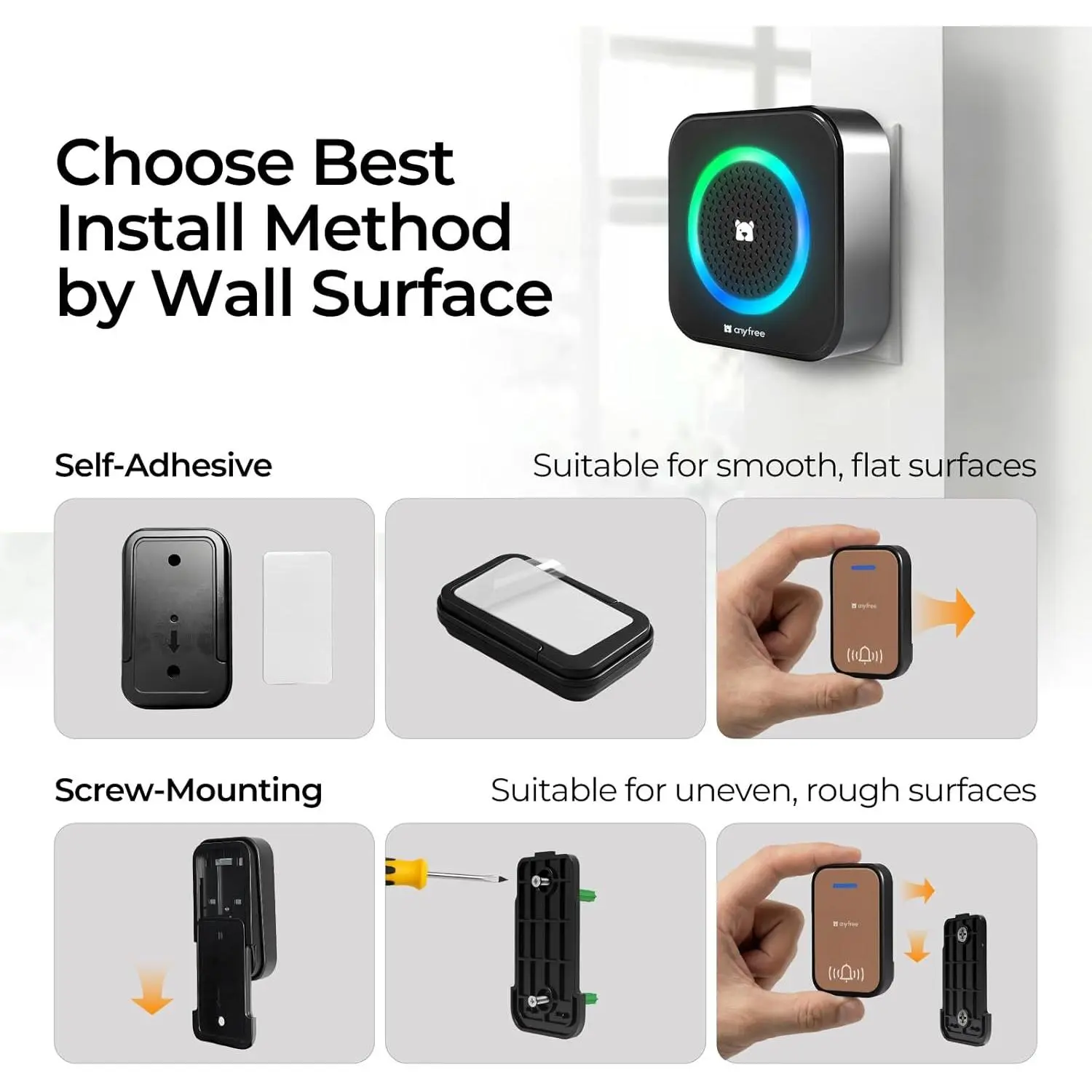· Is this wireless doorbell easy to install? Yes!Two installation methods are available for different walls-use the included adhesive tape for smooth, flat surfaces, or the matching screws (also in the package) for rough, uneven walls.
