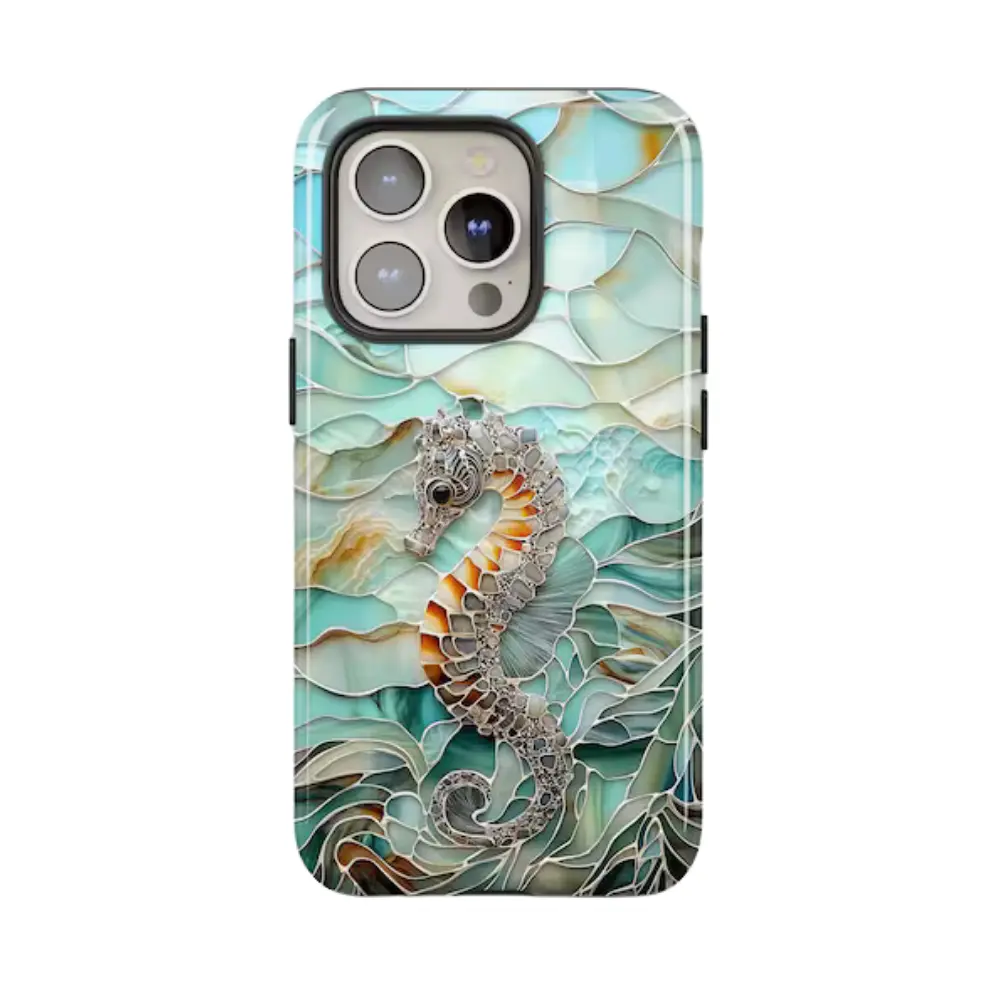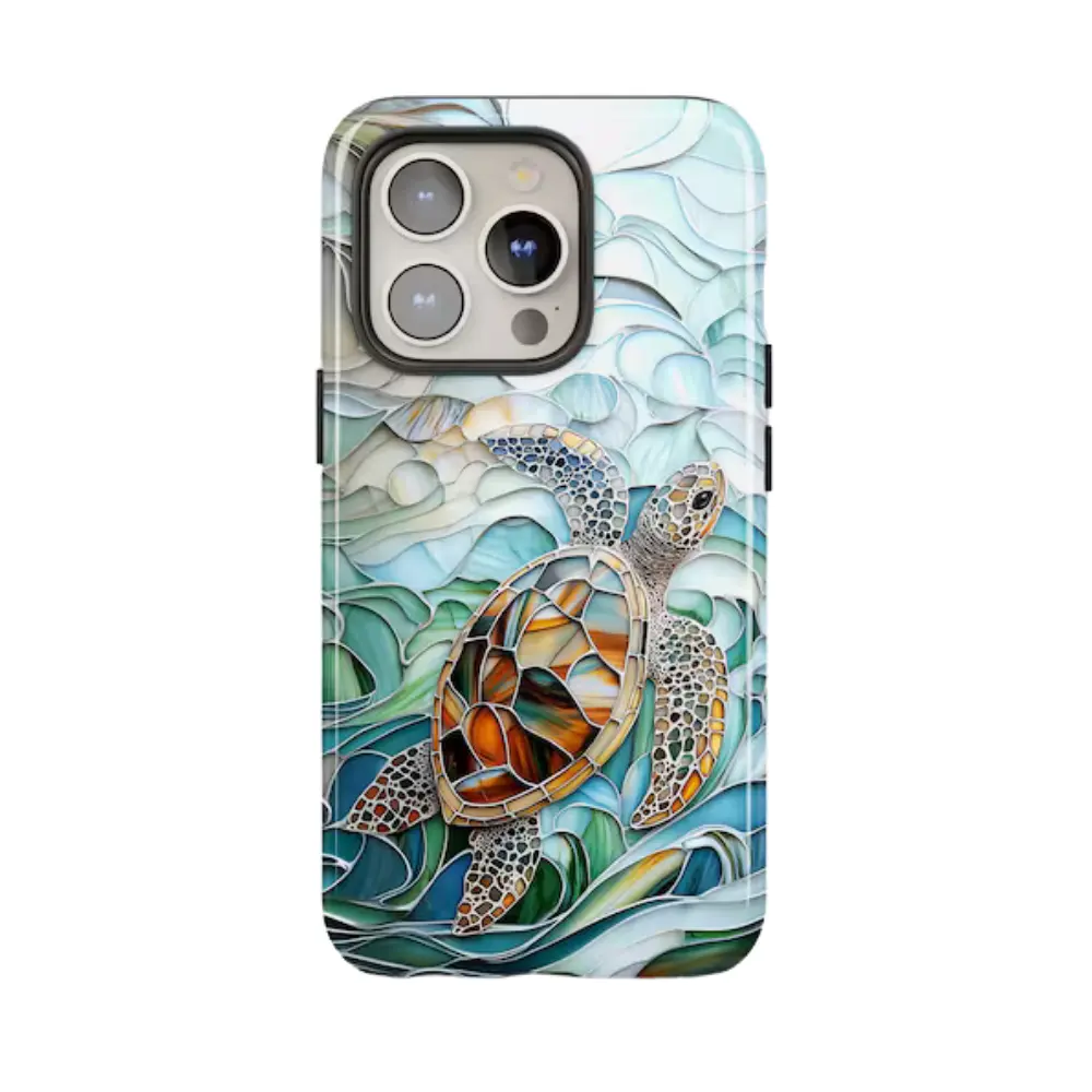 [HOT] Sea Turtle Stained Glass Print Phone Case, Ocean Mosaic Graphic Printed Cover, Coastal Aesthetic Cute Animal Tough Protective Case Gift