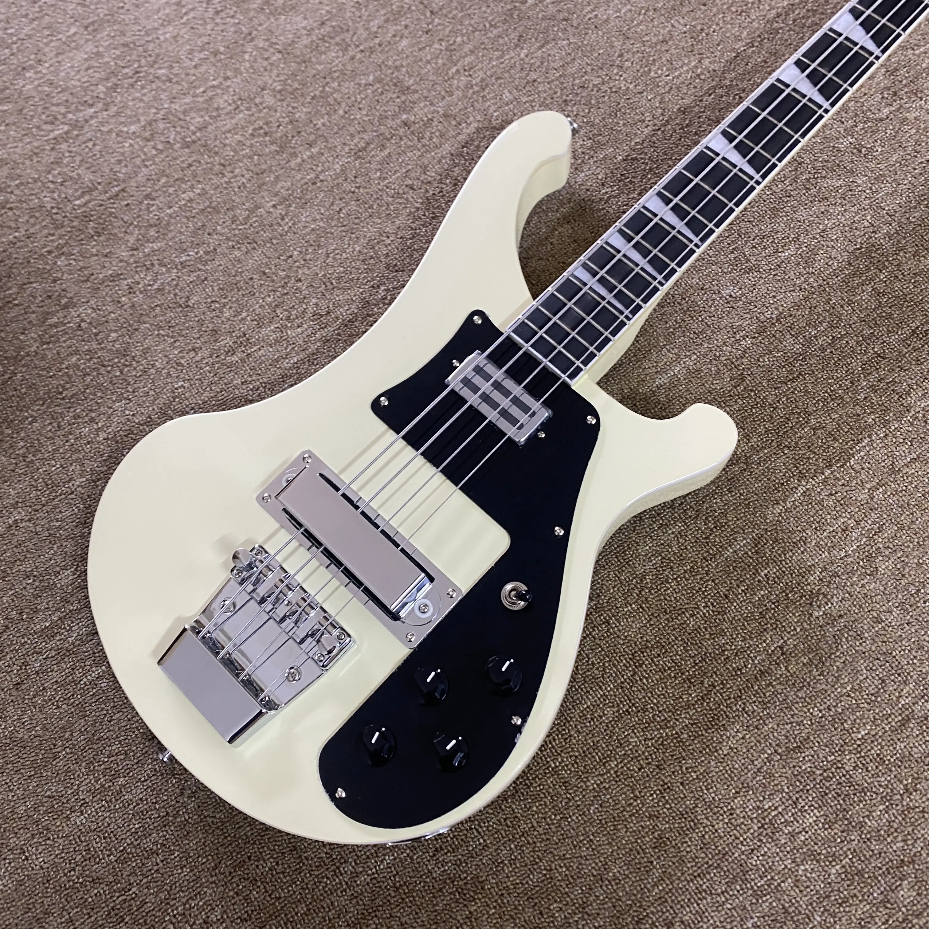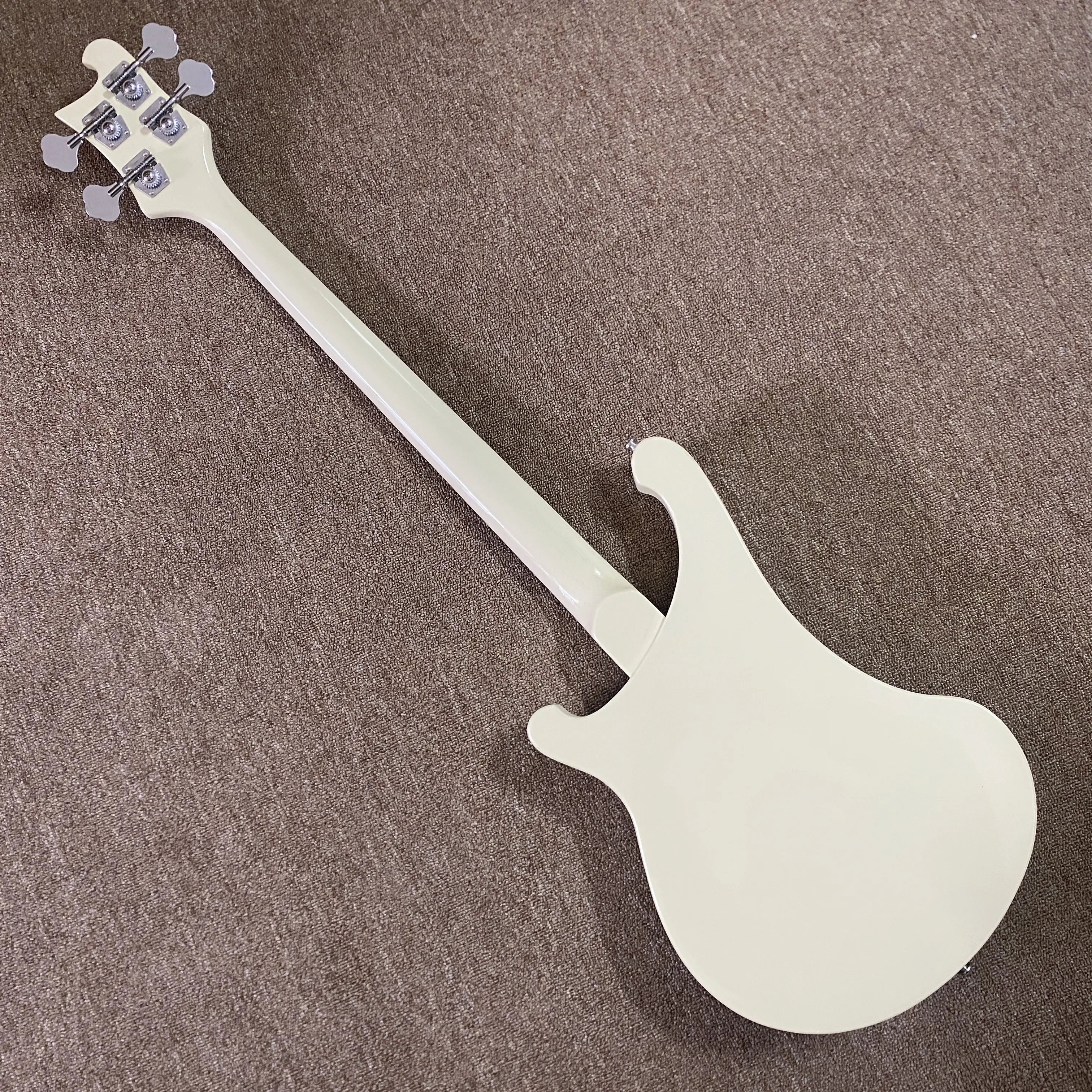 White bass electric guitar with rosewood fretboard, 4 strings, chrome hardware, suitable for both stage and recording studio.