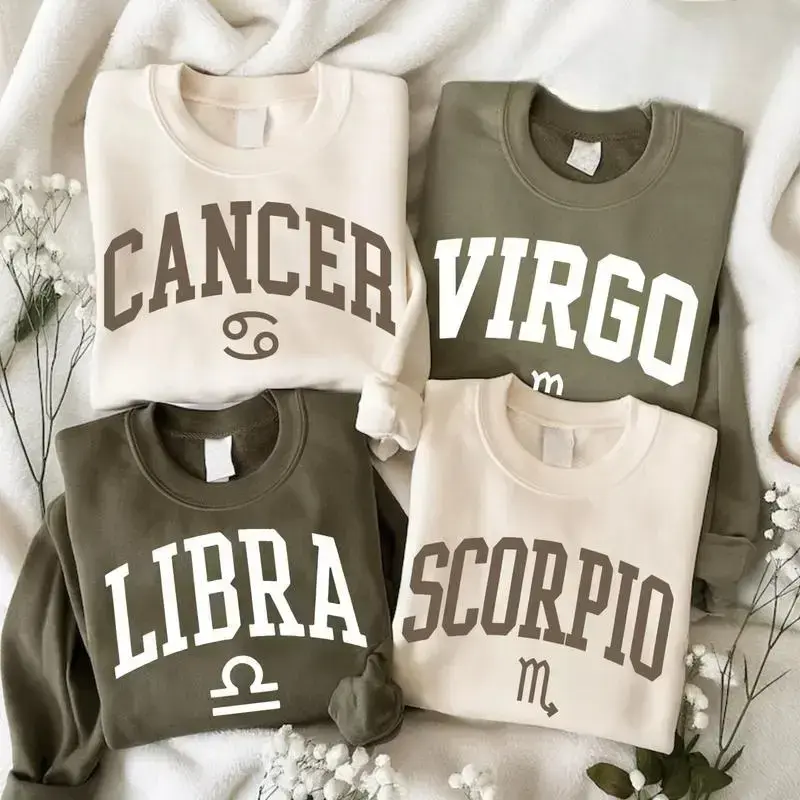Stay cozy while showing off your zodiac sign with this minimalist astrology sweatshirt. Featuring clean, bold lettering for Virgo, Cancer, Libra, and Scorpio, this stylish crewneck blends simplicity with a trendy aesthetic—perfect for everyday wear.