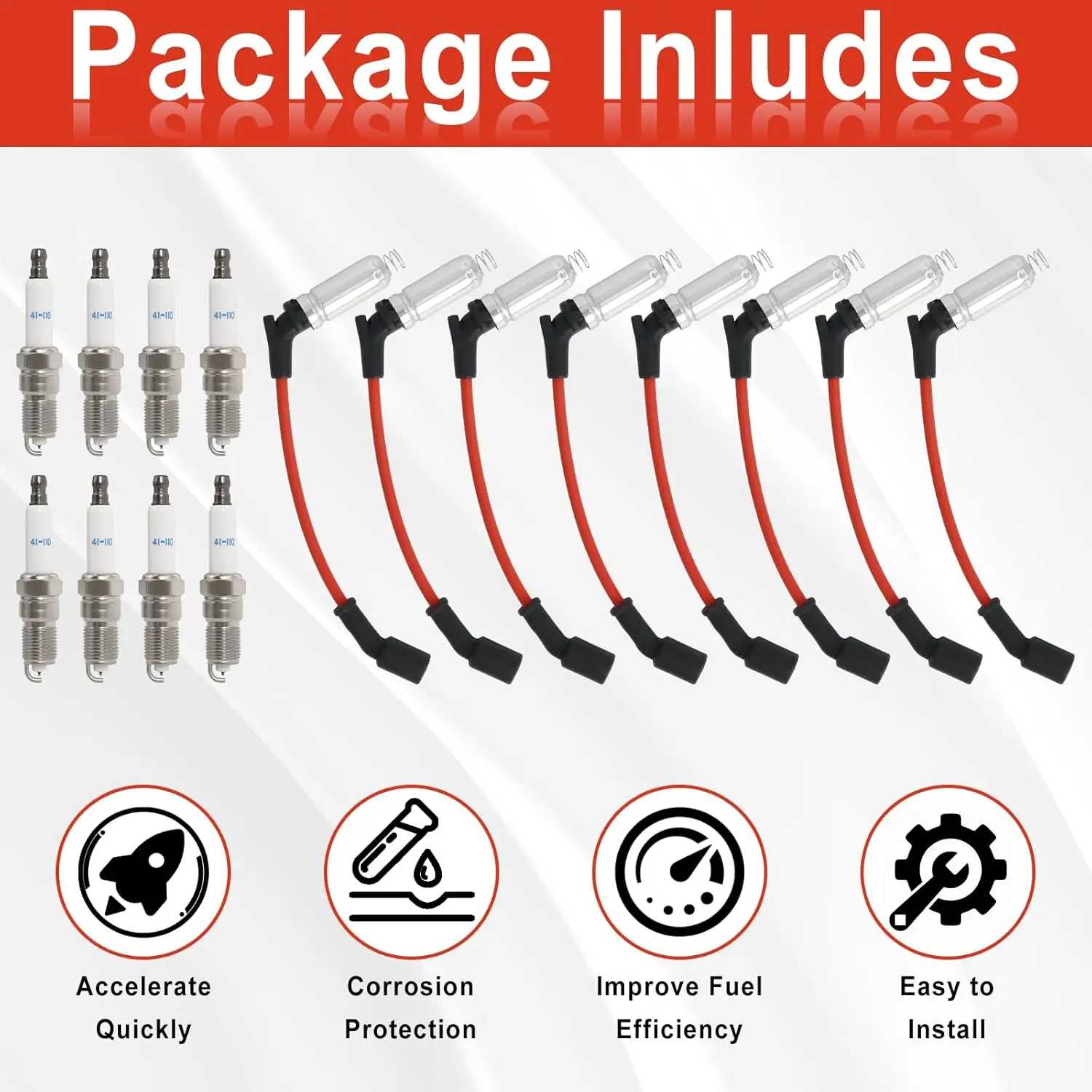 Replacement OEM: Iridium Spark Plugs 8 Pack replace part number: 41-110, 41110, 12680072, 12621258, 41-985, 12609877, 12571164; 8MM Spark Plugs Wires replace part number: M8-48322,48322, 7831, 483227831