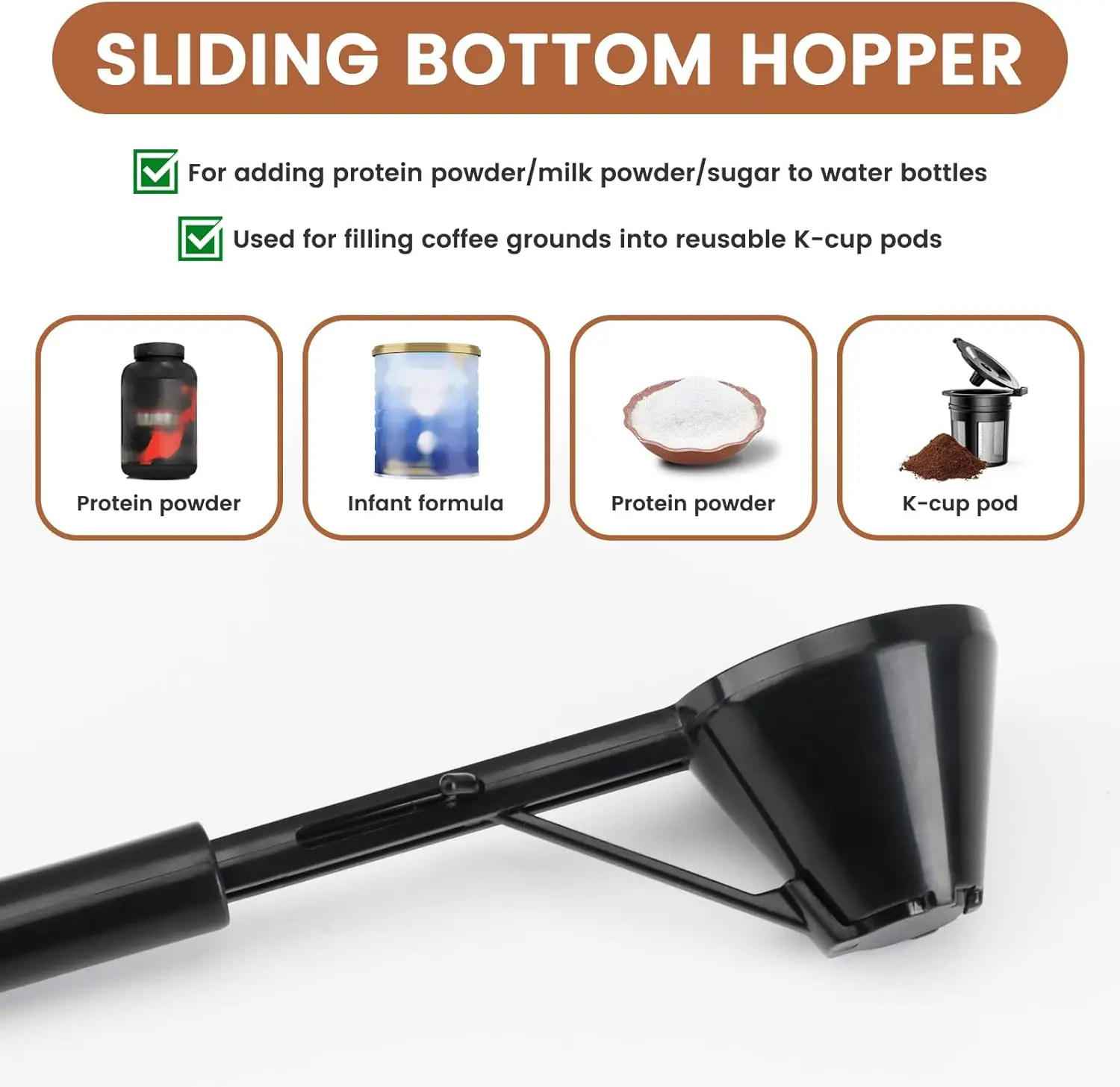 ·Ideal for the Kitchen, Gym, and Everyday Use: Perfect for pouring protein powder into shaker cups, refilling coffee makers, and compatible with reusable pods, it's also suitable for handling a variety of dry ingredients in the kitchen, gym, or office. Its versatility makes it ideal for health enthusiasts, home baristas, and anyone seeking organized powder management