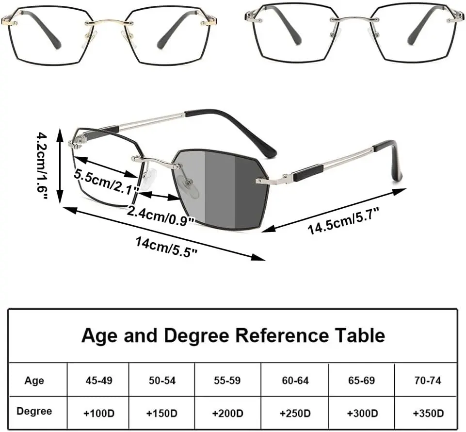 ·Fashionable rimless reading glasses with flexible and elastic metal temples. Suitable for face shapes: rectangular; rhombus square heart-shaped triangle oval round. Polygonal frame design casual business dual use mirror
