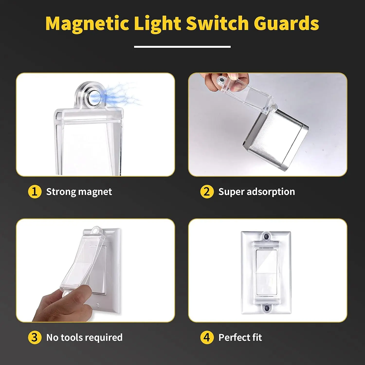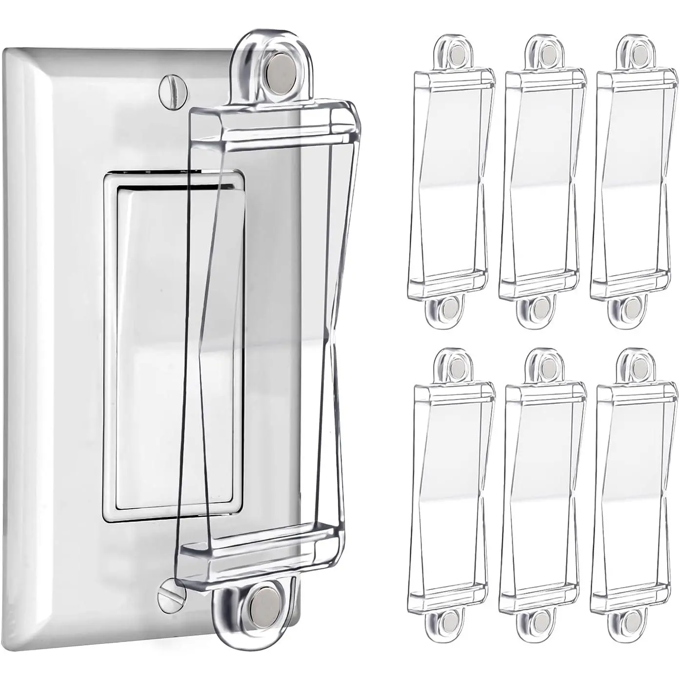 These Magnetic Light Switch Guard Cover can effectively prevents accidental shutdown or opening of items connected to all rocker style switches and also can help you prevents children from messing the switch.Rocker Switch guard Shields Widely suitable for all flat modern switches For paddle switches and european style double light switchesbuilt-in neodymium magnets that instantly attach to switch screws on all rocker switches - no tools or short circuits needed!Durable, high-quality plastic materials,Clear White design for any home decor or wall plate.Only lock is included, No switches or plates.If you are looking for a cover for your White/Clear Magnetic Light Switch Guards, please search for B099QSHC1N in the search bar.