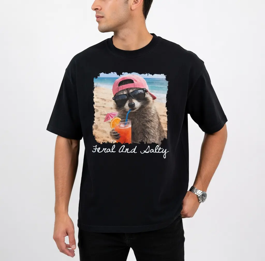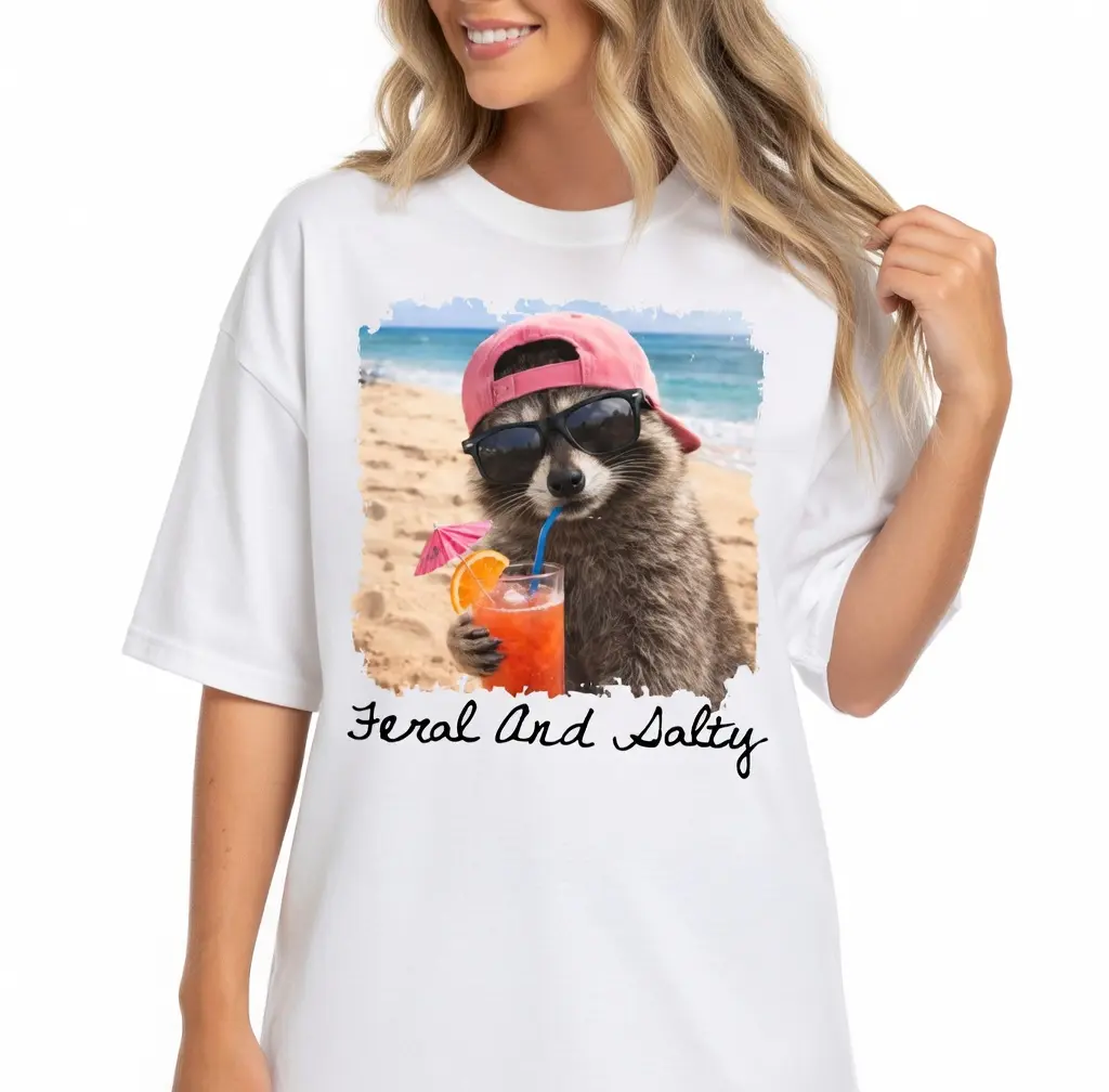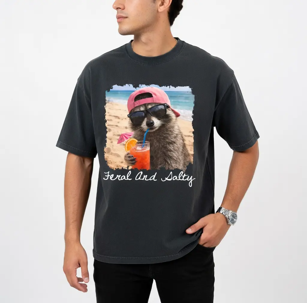 5. Feral And Salty Comfort Colors T-Shirt, Funny Beach Raccoon Shirt, Salty Summer Vacation Graphic Tee, Coastal Raccoon Meme Shirt