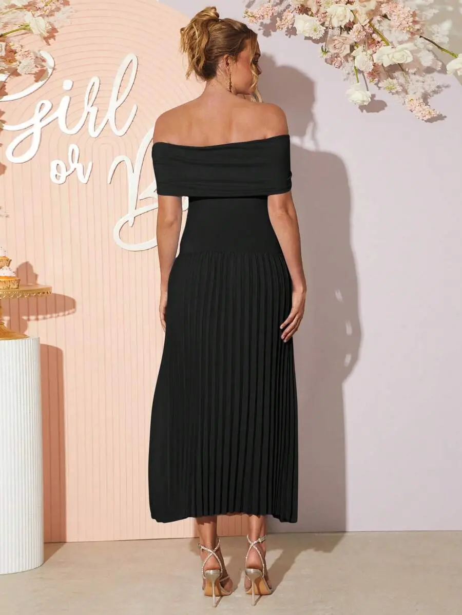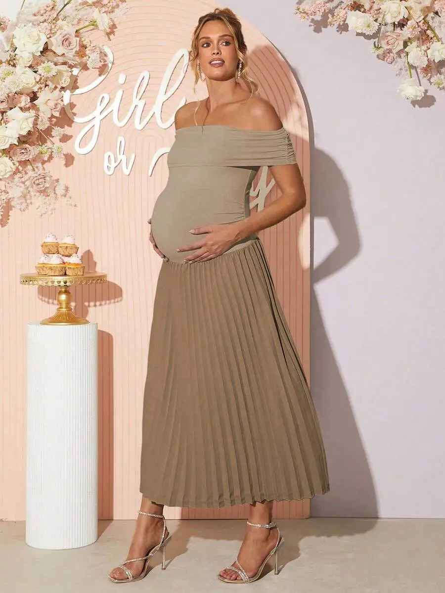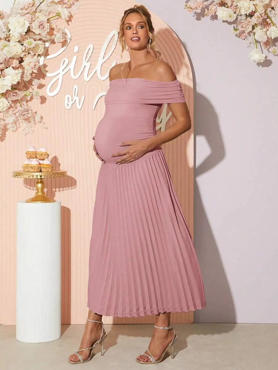 JOYCEE Pregnant Women Solid Color Off Shoulder Short Sleeve Pleated Hem Elegant Dress Maternity Dress