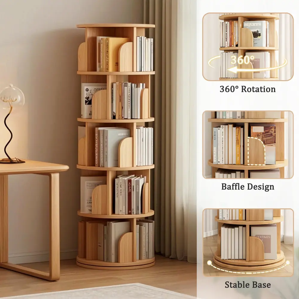 Efficient Storage in Small SpacesThis: 360° rotating bookshelf is designed for small spaces. With its rotating function, users can easily access books or decorations from all angles, and it can also be easily used in places with limited space such as bedrooms and living rooms.