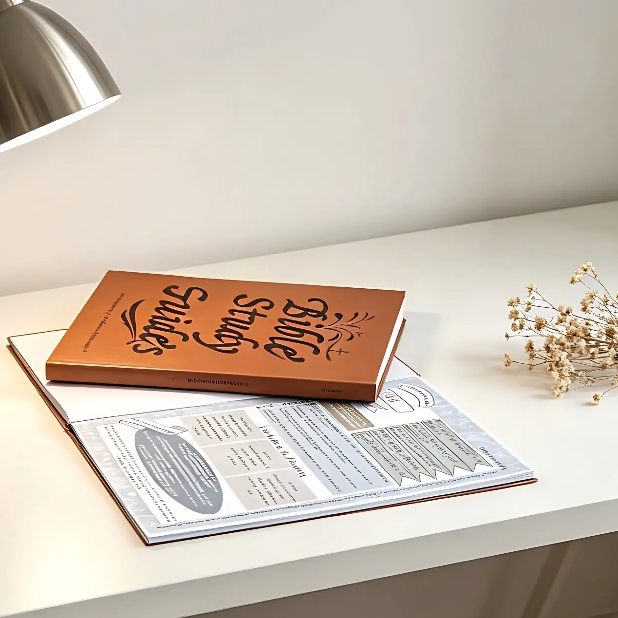66-Page Bible Study Guide with PU Leather Cover. Features daily scripture excerpts for prayer, reflection, and growing in faith and knowledge