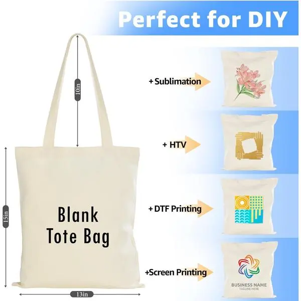• These blank tote bags support multiple customization methods including sublimation, HTV, screen printing, DTF transfer, embroidery, and hand painting. Ideal for personalized text, logos, or artwork. Not recommended for tie-dye.