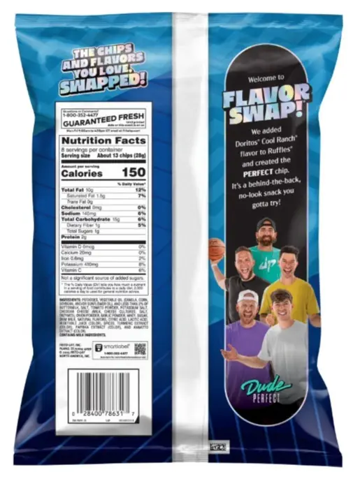 ·Includes 1 (8 oz) bag(s) of Ruffles Potato Chips, Doritos Cool Ranch Flavor Snack Chips