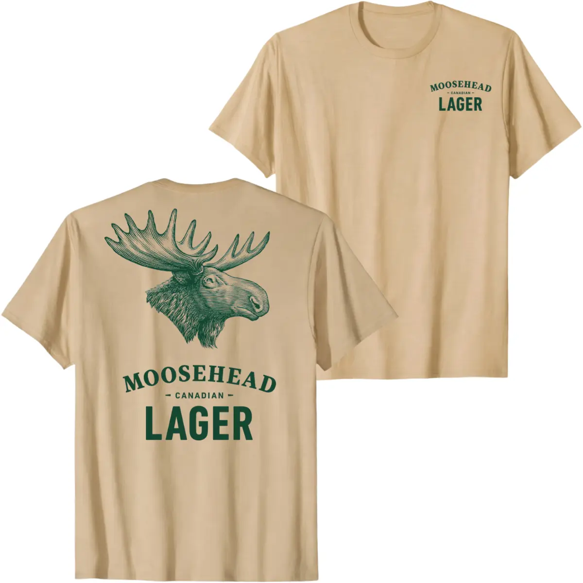 5. Moosehead Lager Moose Graphic Beige T-Shirt with Large Antlered Deer Head Illustration Print, Vintage Canadian Beer Style Streetwear Tee for Men Women Unisex Casual Summer Shirt