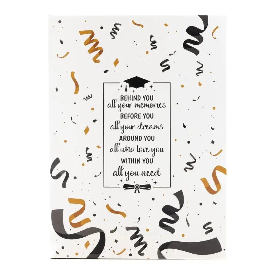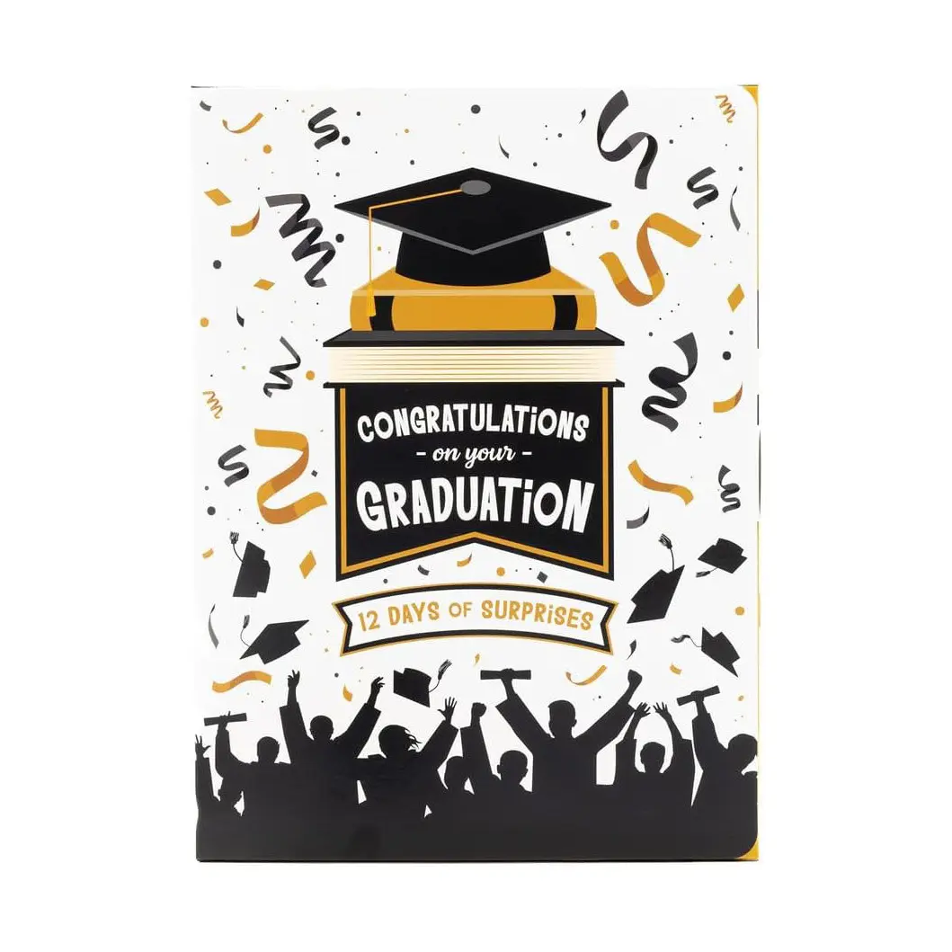 Create a memorable graduation experience with this unique gift box. It includes 12 doors, each revealing a surprise gift for the graduate. The box features a stylish black, white, and gold Graduation design. Perfect for personalizing gifts for the graduate in your life.