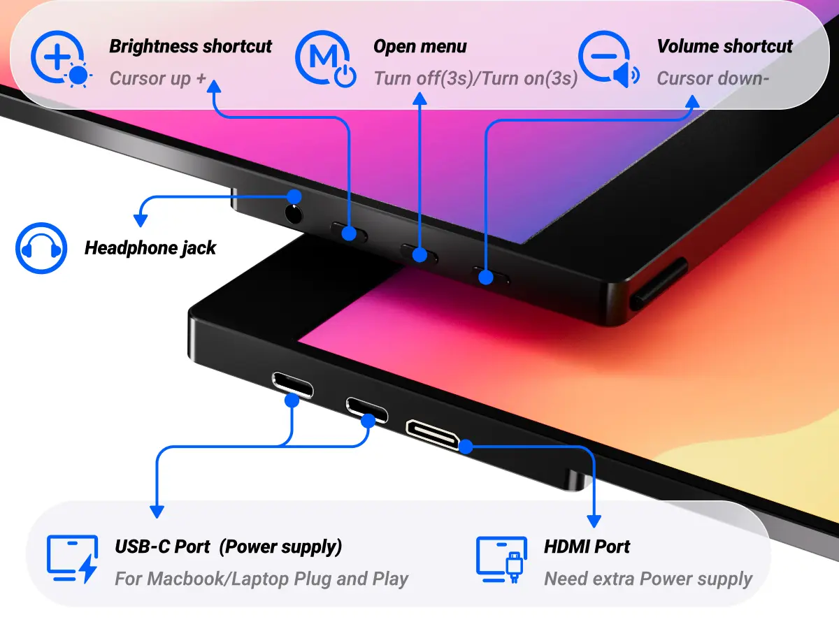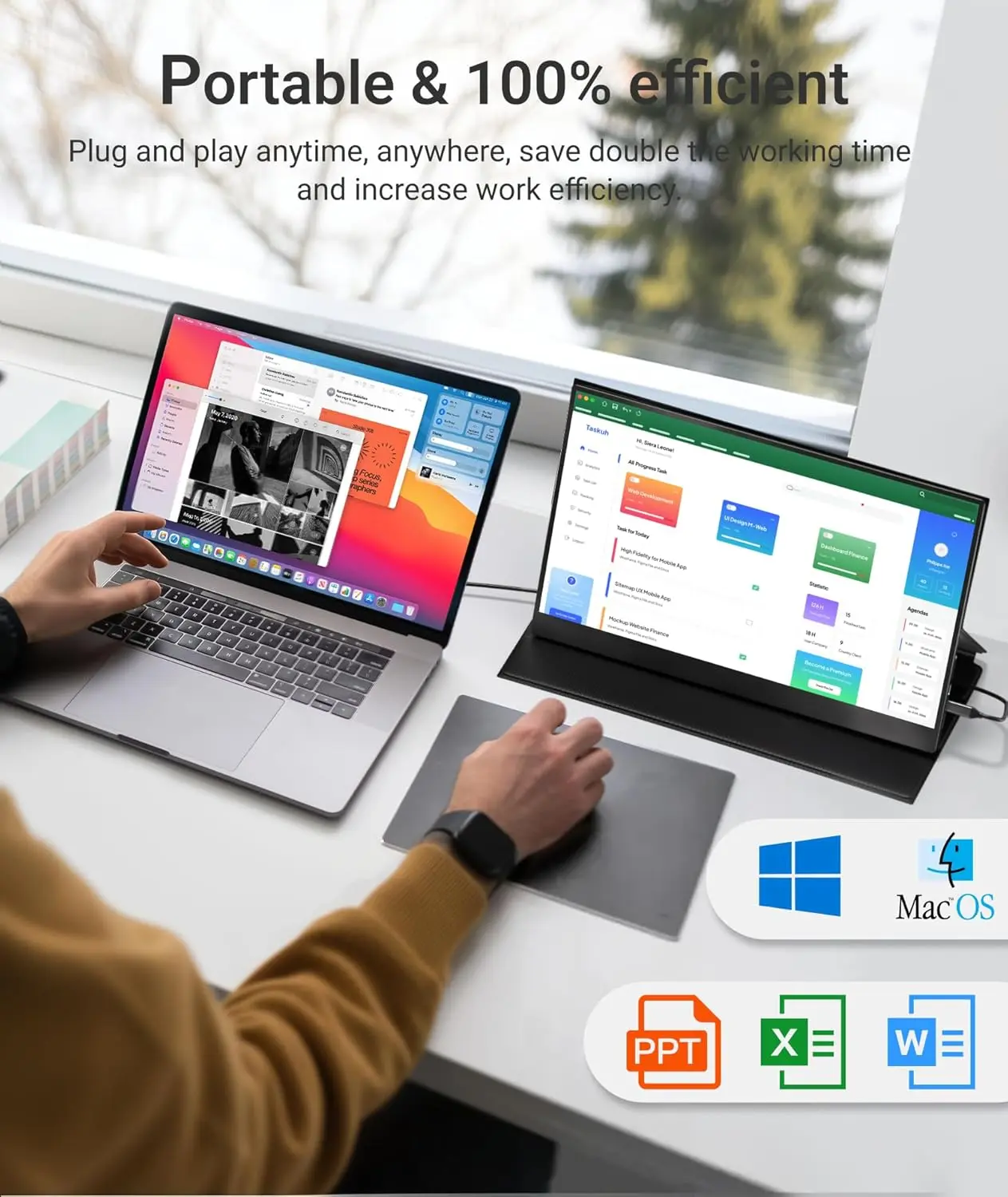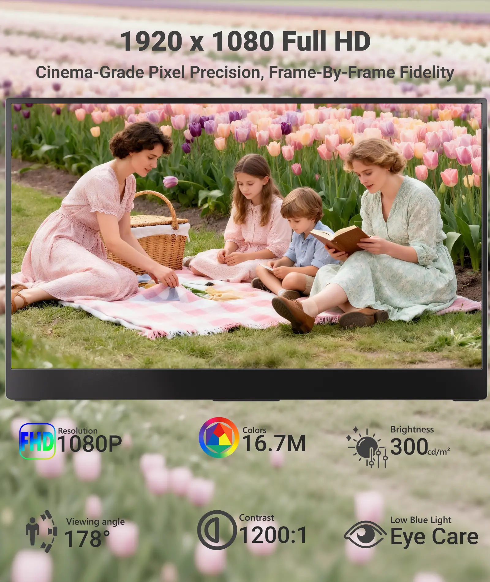 Vibrant Display: 15.6-inch FHD 1080P IPS screen with HDR support for stunning visuals. Ultra-Slim Design: Lightweight and travel-friendly. Fits perfectly in your laptop bag. Widely Compatible: Features USB-C and HDMI ports. Works with MacBook, Windows PC, PS5, Switch, and more. Leather Cover Stand: Comes with a premium smart cover that protects the screen and provides multiple viewing angles.