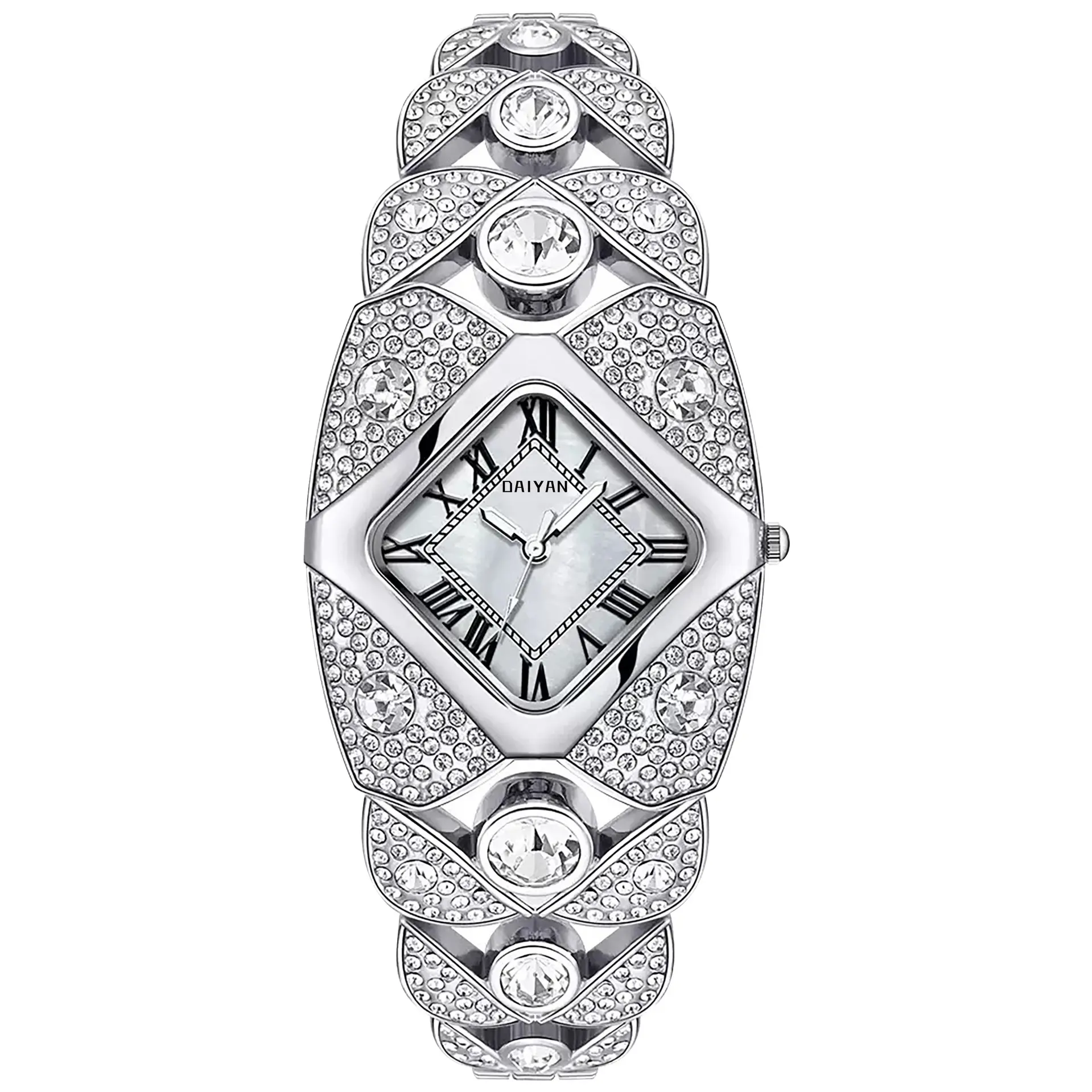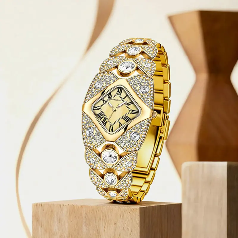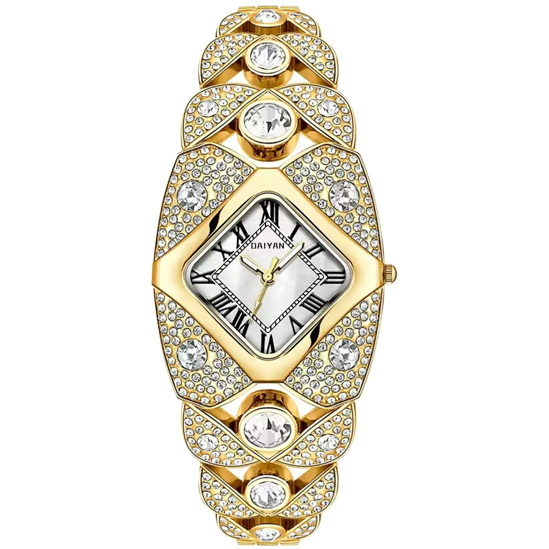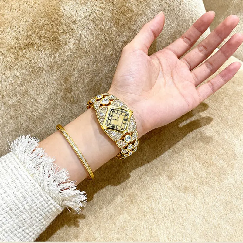 Women's Luxury Gold Iced Out Diamond Bracelet Watch - Square Mother of Pearl Dial with Roman Numerals, Fully Bling Crystal Encrusted Quartz Wristwatch, Perfect Gift for Her