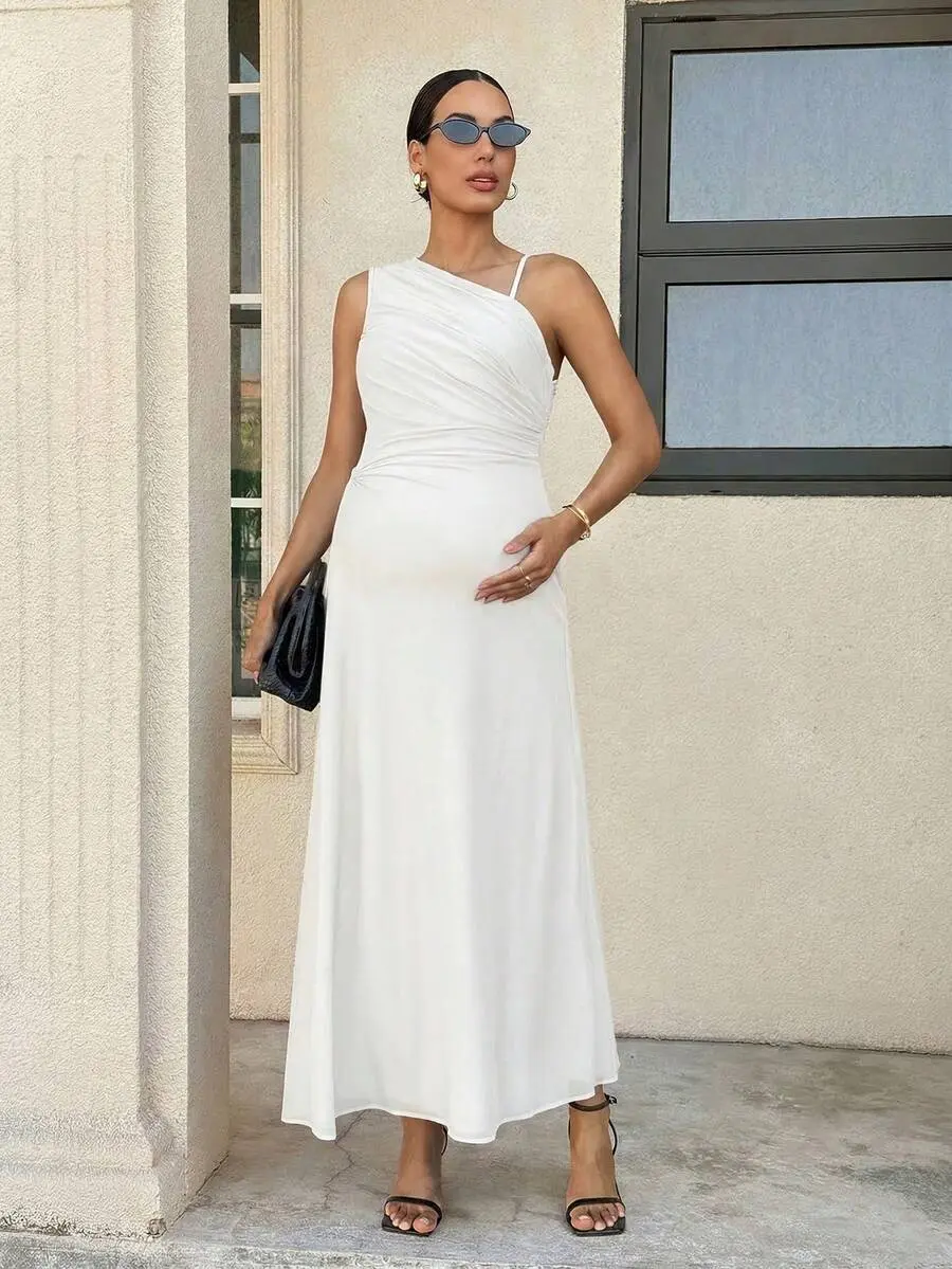 TAMALLA Elegant Maternity Commuter Solid Color Asymmetric Collar Dress, Summer