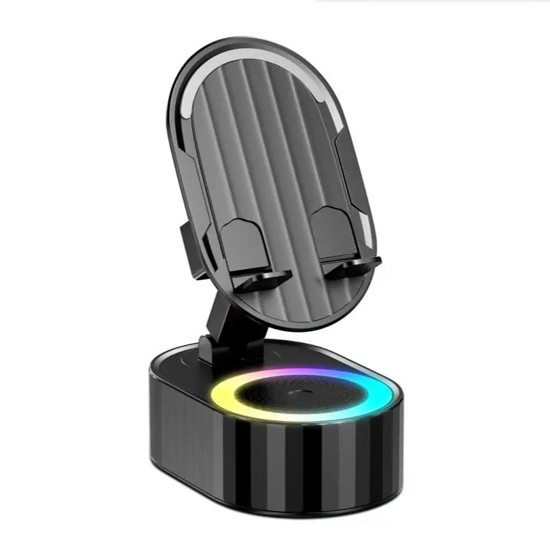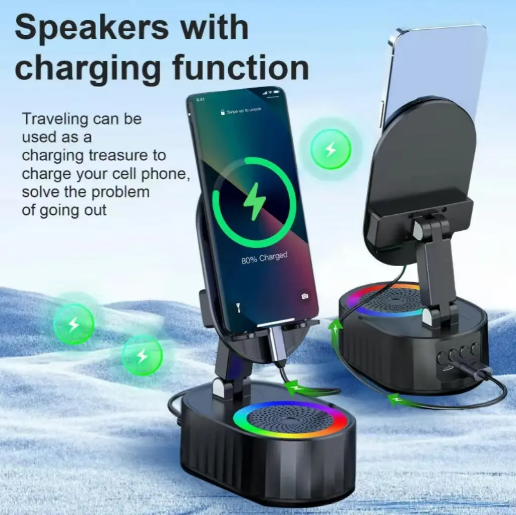 5in1 Wireless Speaker Cell Phone Stand with Bluetooth/Induction Audio & Atmosphere Light/Power Bank, 5.3 HD Surround Subwoofer Sound,300° Rotable Foldable Lift-Non-Slip Base, Fits Smart Phones