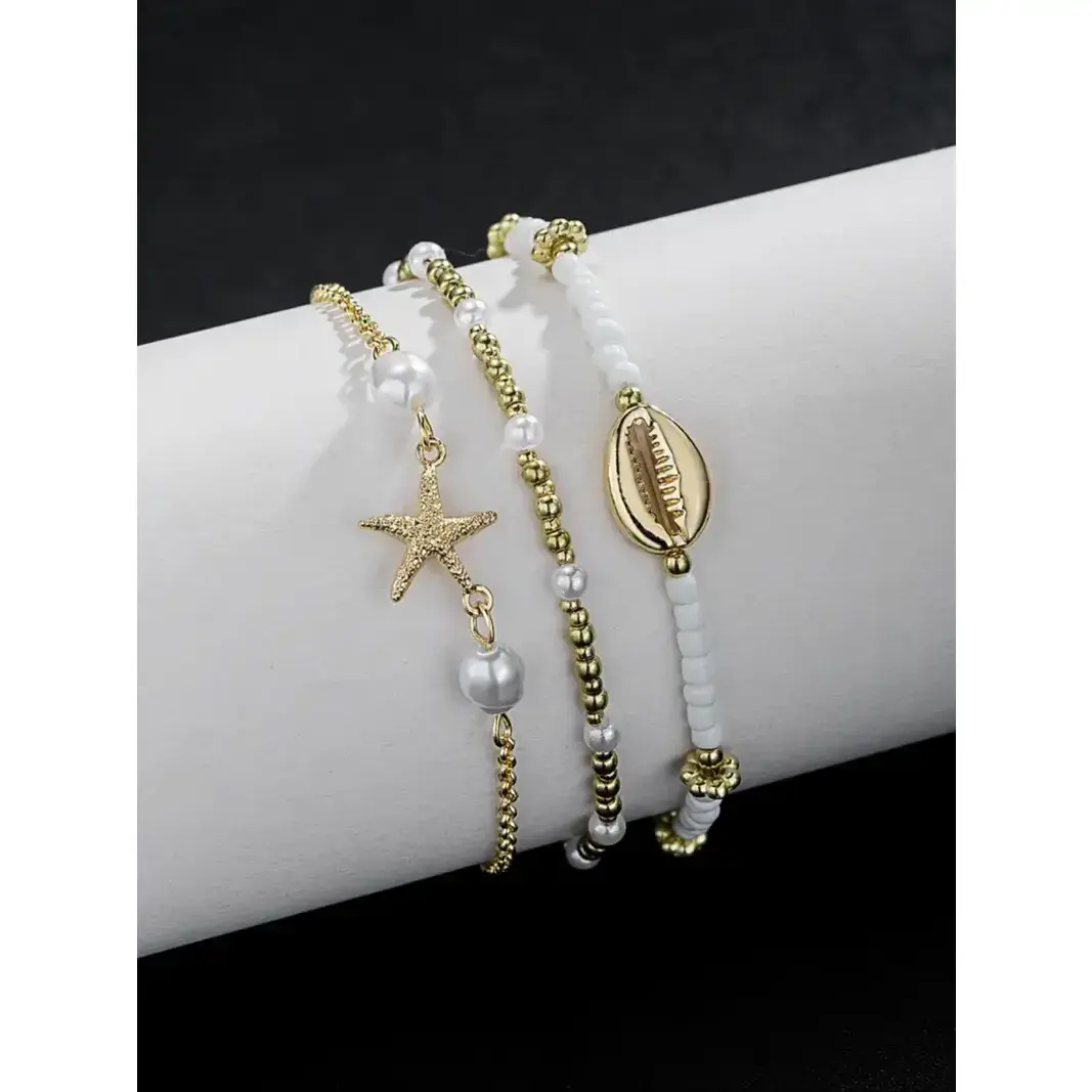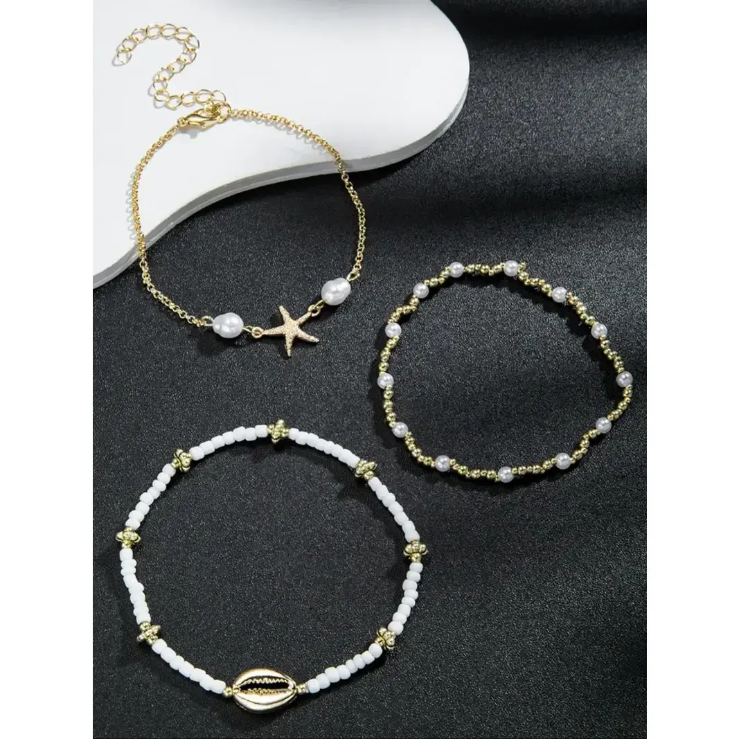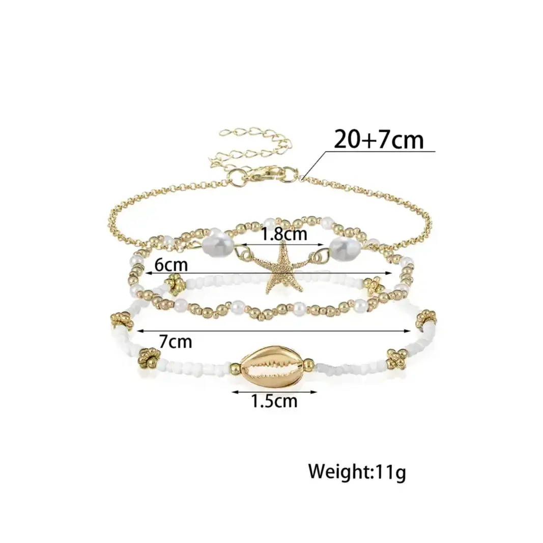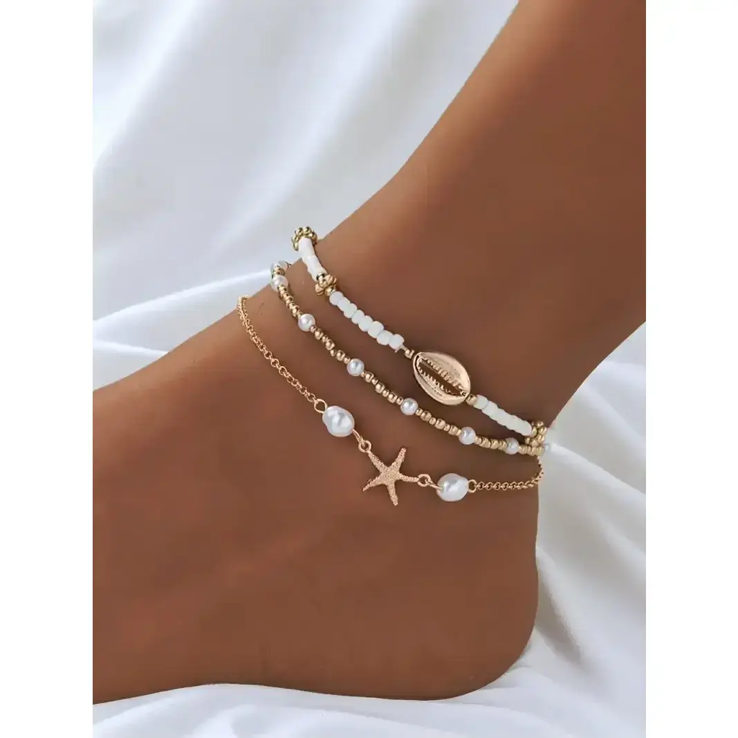 Tropical Boho Design: 3 layered chains with unique details: a dainty gold chain with starfish & pearl charms, a beaded chain with a gold cowrie shell, and a tiny gold bead chain for a stacked, effortless look.✅ Premium Quality: 18K gold plated, hypoallergenic, lead-free & nickel-free, gentle on sensitive skin, and fade-resistant for long-lasting wear.✅ Fully Adjustable: One size fits most, with a flexible design that ensures a comfortable, secure fit for all ankle sizes.✅ Versatile Style: Perfect for beach trips, summer vacations, pool days, date nights, festivals, or everyday casual wear. Pairs flawlessly with sandals, flip-flops, heels, or bare feet.✅ Ideal Gift: A thoughtful, beautiful gift for your girlfriend, wife, mom, best friend, or travel buddy for birthdays, anniversaries, or summer getaways.