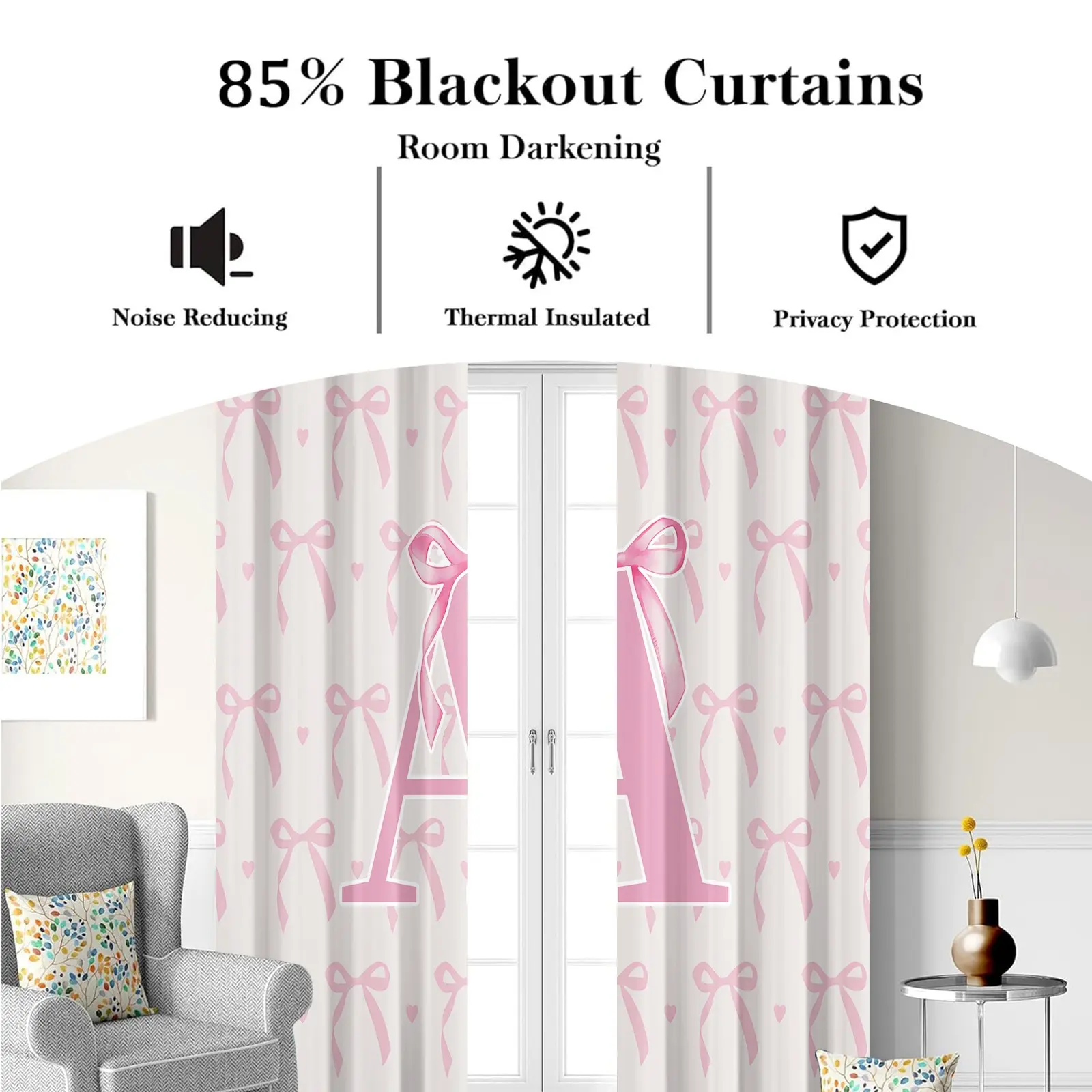 5. 2Pcs Pink Romantic Ballet Bow Alphabet Blackout Curtains, 85% Light Blocking, Easy Open & Removable, for Home Dorm Hotel Room Decor, Perfect for Housewarming Birthday Christmas Gifts