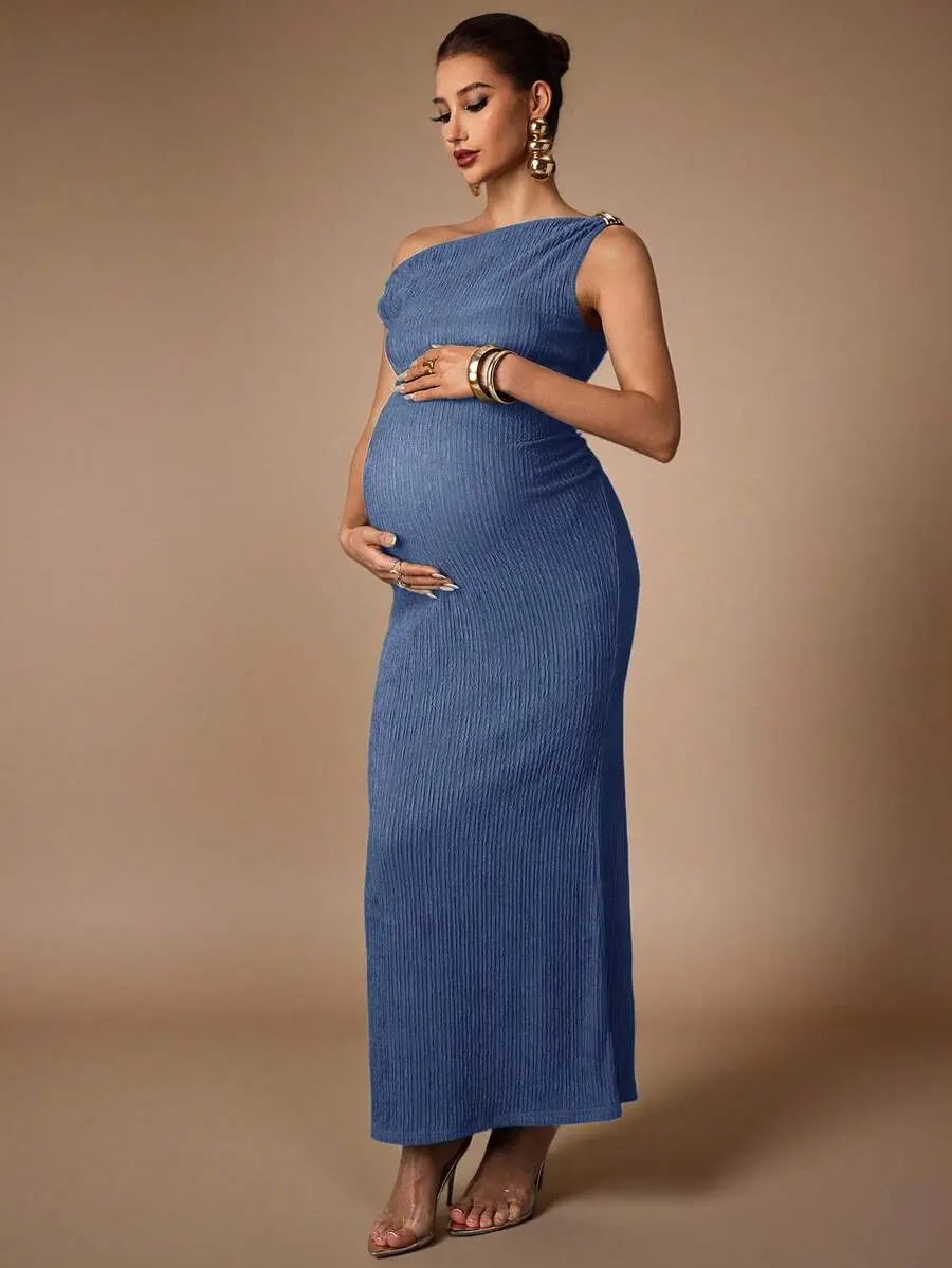 ELARA Pregnant Women Solid Color Oblique Shoulder Metal Decor Fitted Elegant Dress