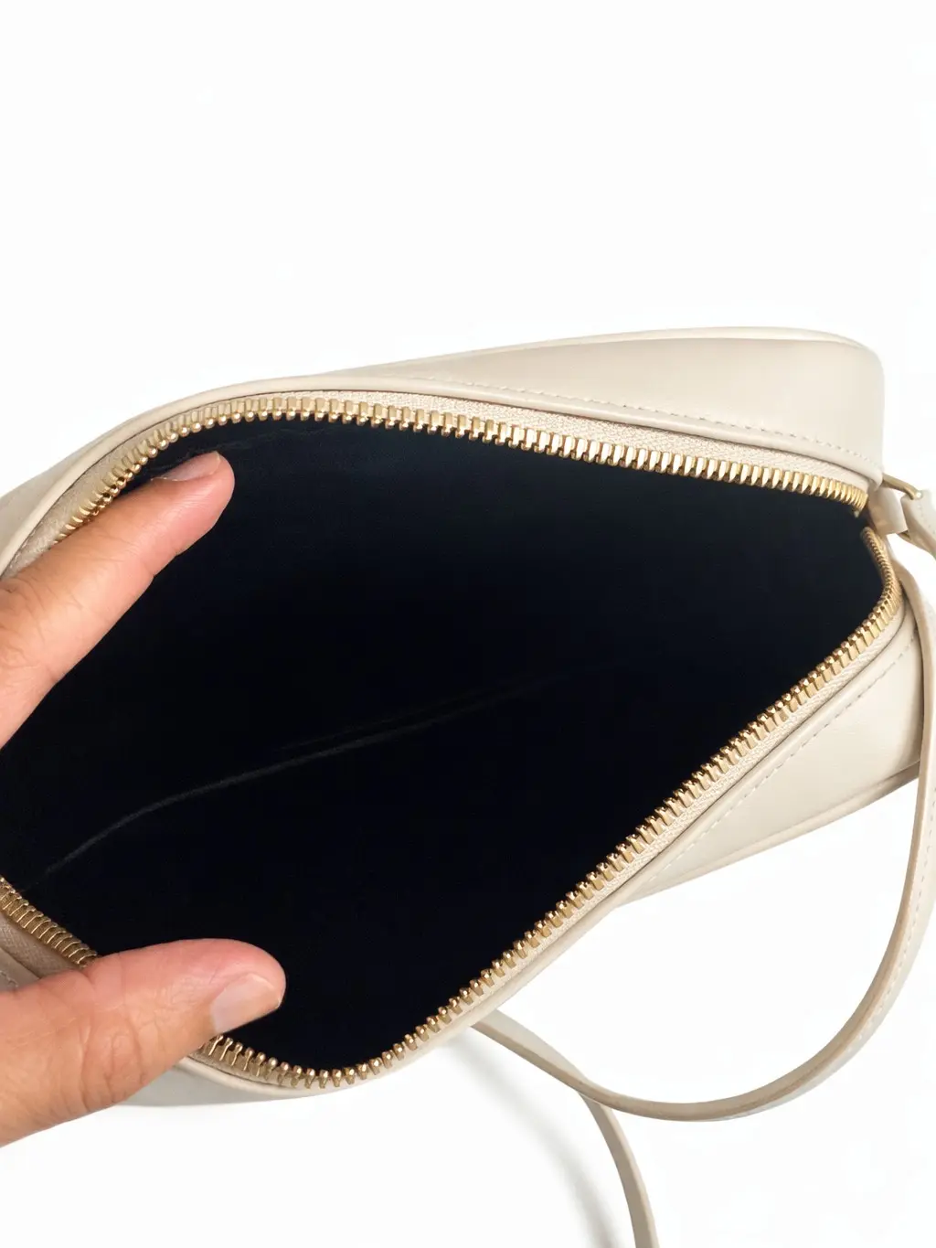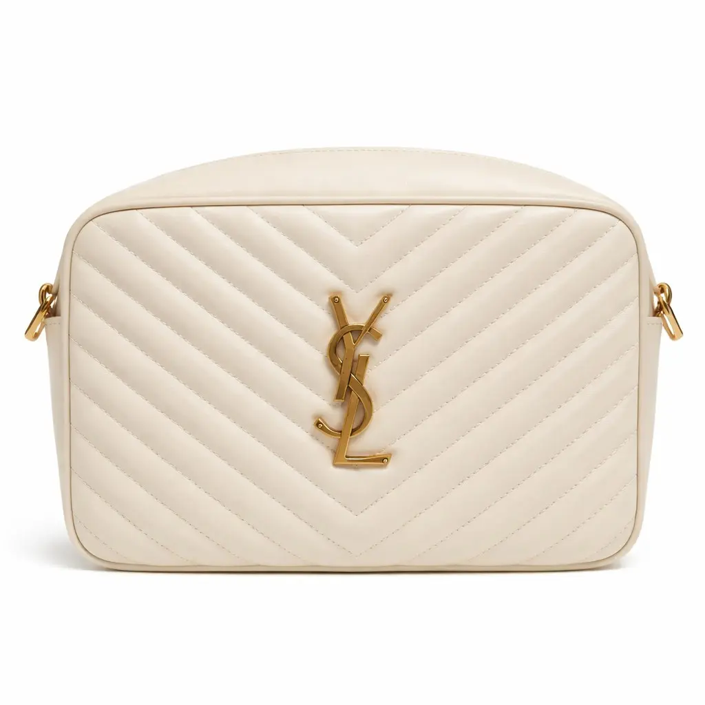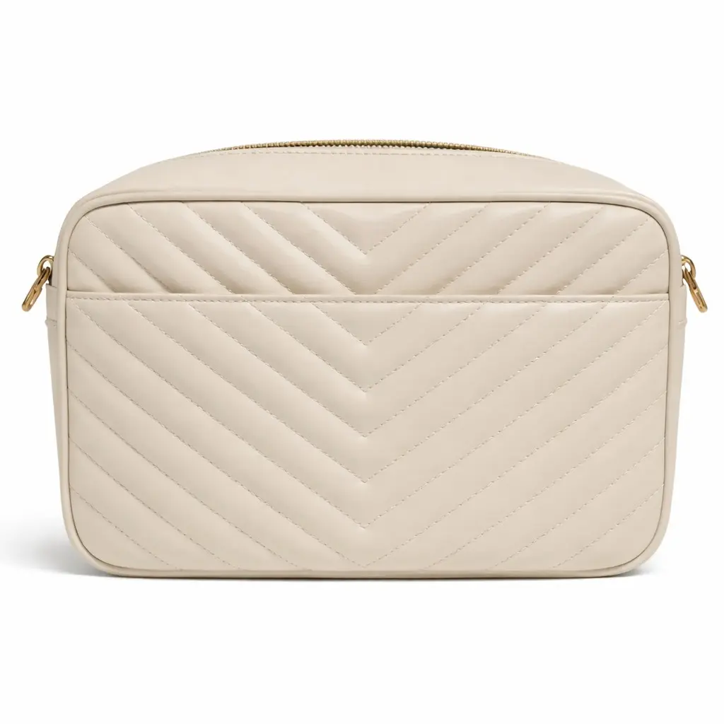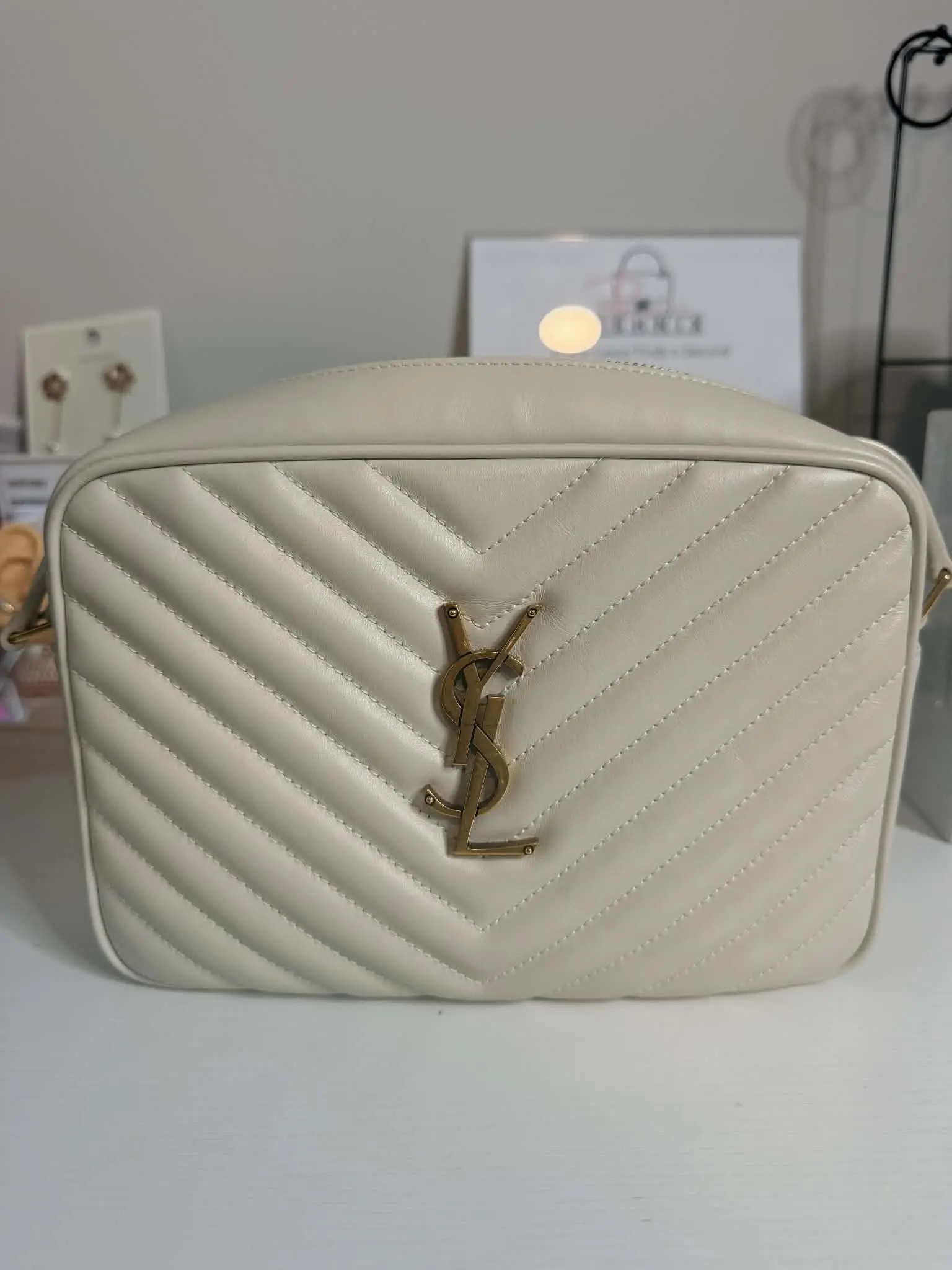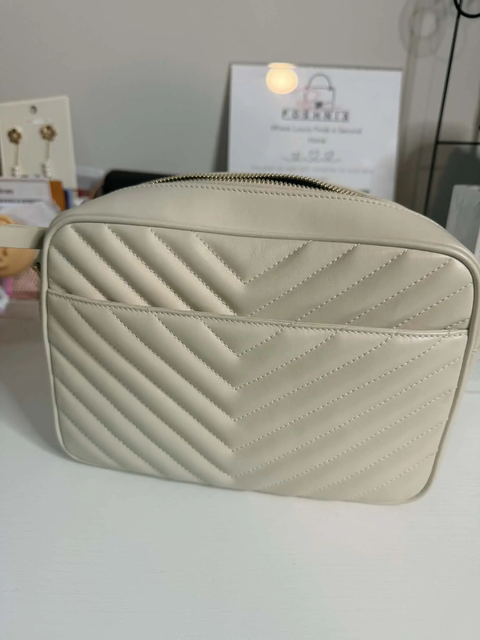 This is an authentic Saint Laurent Lou Camera Bag crafted from soft beige/cream quilted leather in the iconic chevron pattern. The bag features the signature YSL monogram in gold-tone hardware, a structured yet compact silhouette, and an adjustable leather strap for comfortable crossbody or shoulder wear. It is designed with a top zip closure that opens to a spacious fabric-lined interior with a slip pocket, perfect for daily essentials such as your phone, wallet, and small accessories. Finished with durable hardware and smooth leather trims, this piece offers a timeless and versatile luxury look.