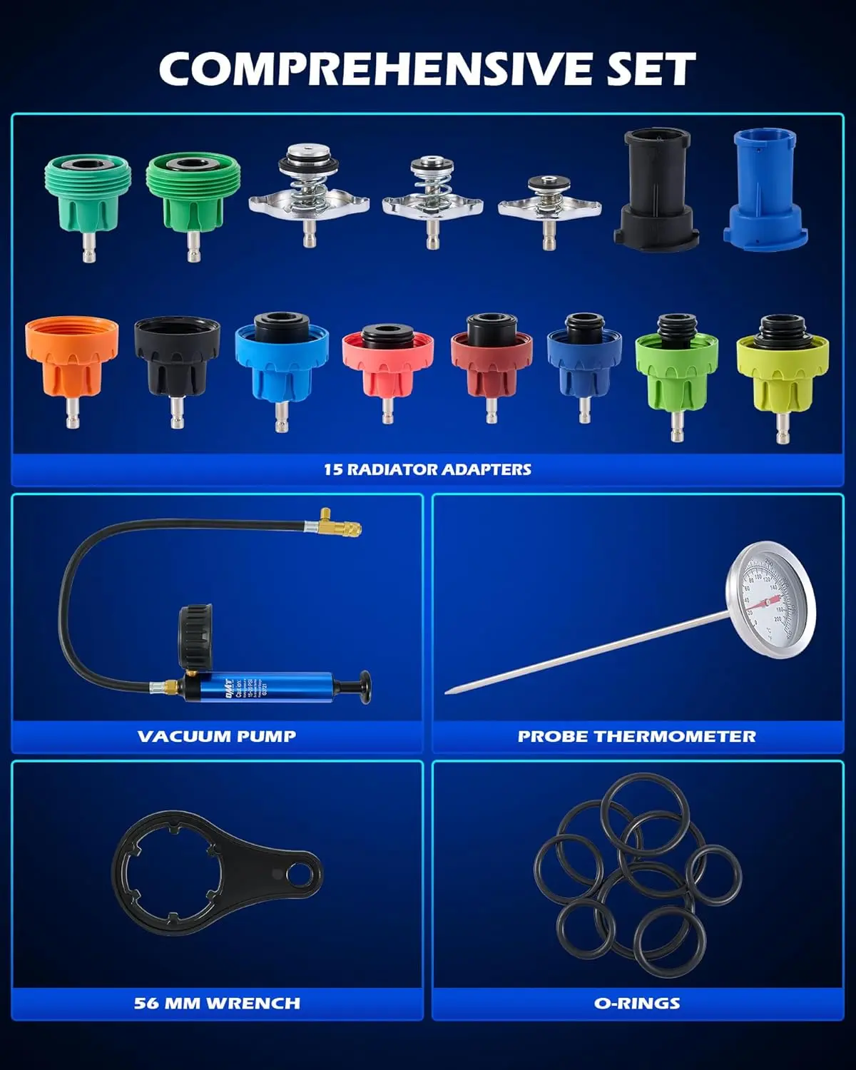 ·Features 15 radiator adapters compatible with car brands like BMW, Ford, Fiat, VW, Porsche, Mercedes-Benz, Nissan, Peugeot, and Chrysler