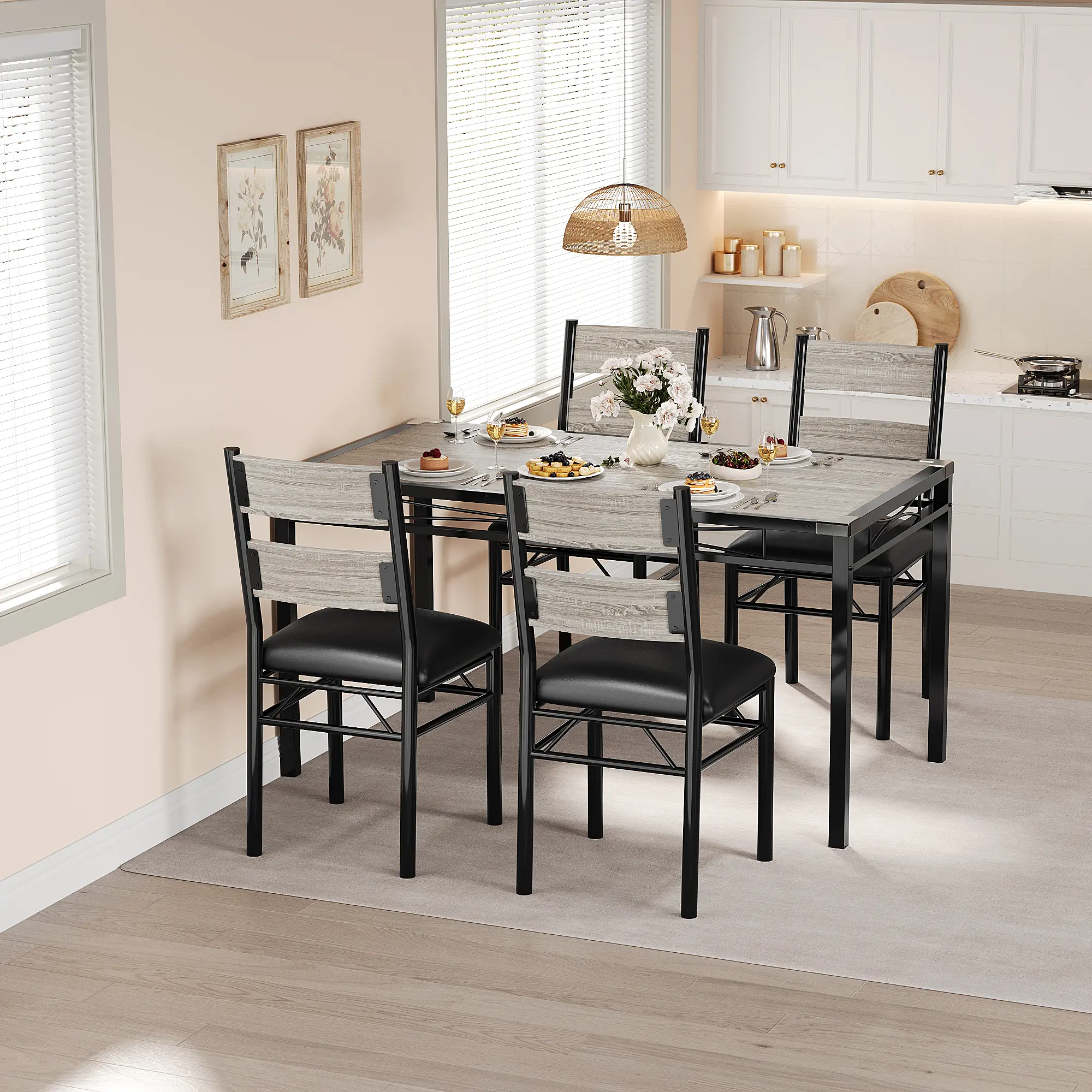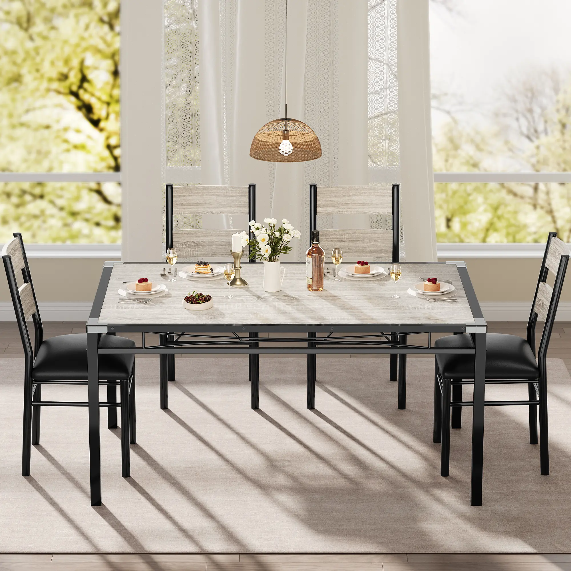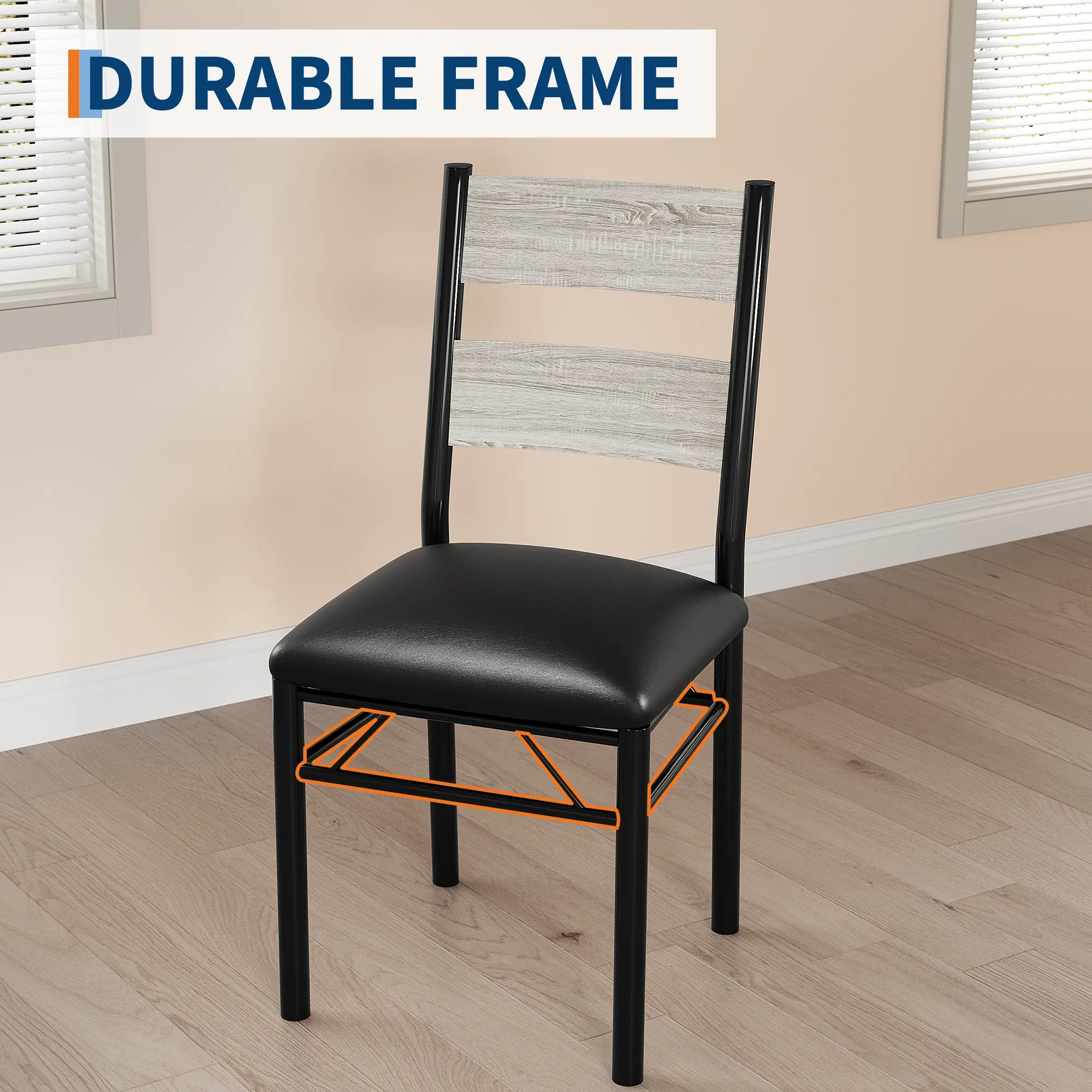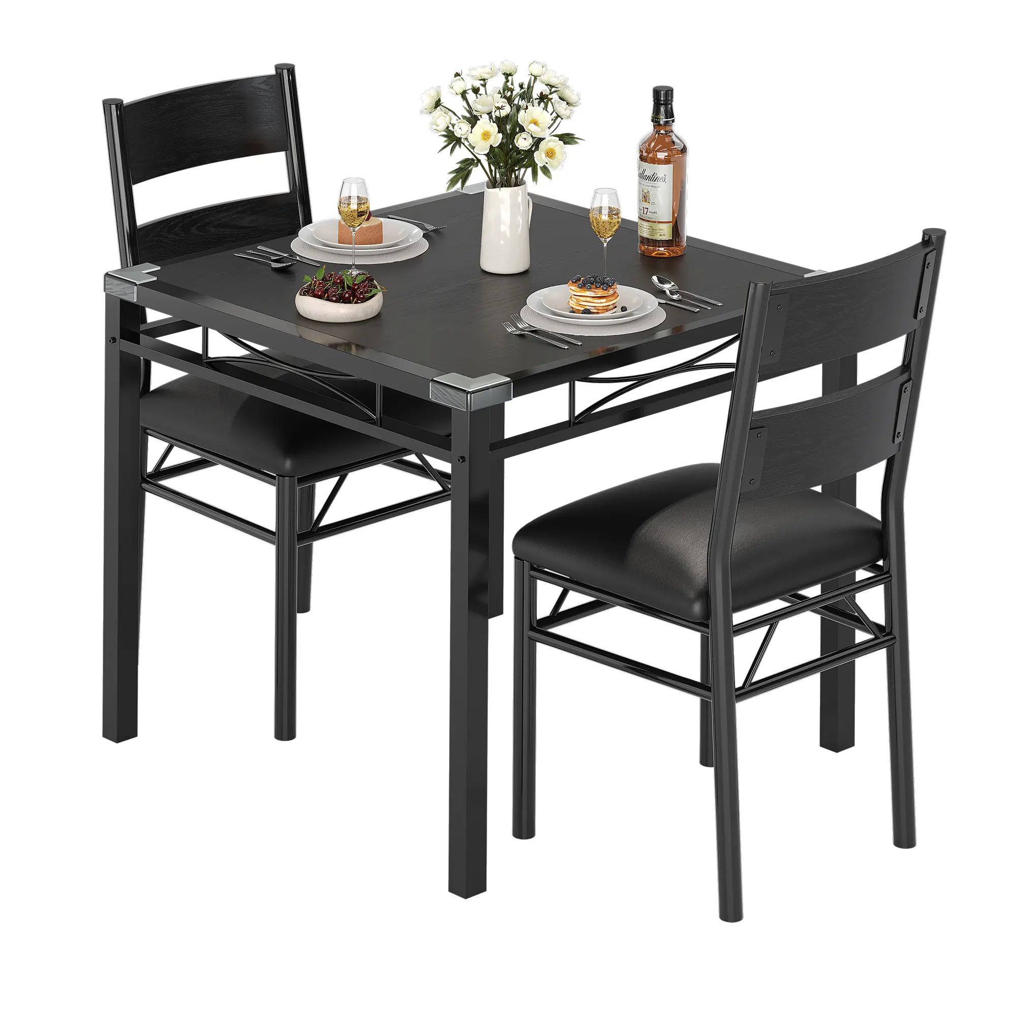 Modern 3-Piece Dining Table Set for 2Upgrade your dining area with this stylish and practical 3-piece dining set, designed for modern living spaces. Ideal for apartments, kitchen nooks, or small dining rooms, this set offers both space-saving solutions and a cozy ambiance for meals, coffee breaks, or remote work.Complete Set Includes: 1 dining table (29.1"L x 29.1"W x 29.5"H) and 2 matching chairs (15.6"L x 17.7"W x 35.8"H), perfect for seating up to two people comfortably.Superior Construction: The table features a high-quality MDF tabletop with a smooth, waterproof, and mark-resistant finish, supported by a reinforced steel H-frame. Chairs are equipped with soft PU-cushioned seats and ergonomic backrests for excellent comfort and support (each chair supports up to 400 lbs; table up to 300 lbs).Designed for Safety & Stability: Corner protectors minimize impact injuries, making it family-friendly. Non-slip feet prevent shifting and protect your floors.Space-Saving & Practical: Both chairs slide fully underneath the table, maximizing floor space and maintaining a tidy look—ideal for small kitchens or dining rooms.Easy to Assemble & Maintain: Assemble in about 30 minutes with all tools and illustrated instructions included. The durable tabletop is simple to clean and maintain, ensuring long-lasting beauty.Contemporary Style: The industrial faux woodgrain finish complements a variety of interior styles, blending seamlessly with modern decor.Experience a perfect balance of style, strength, and convenience with this compact dining set—your ideal solution for small-space dining that doesn’t compromise on comfort or durability.