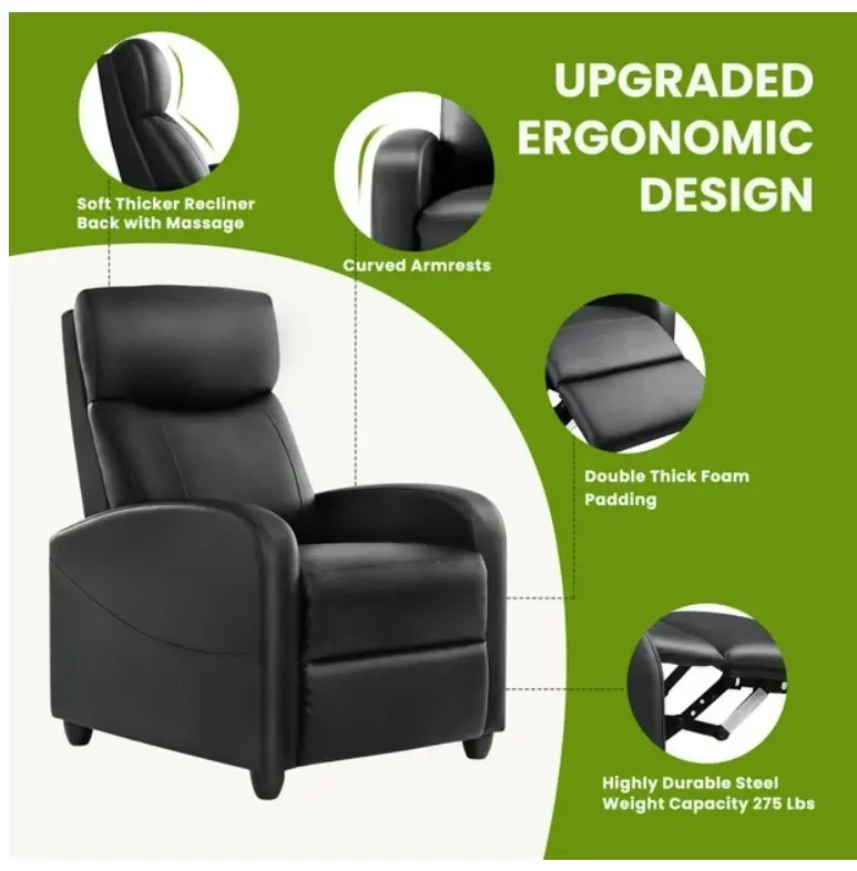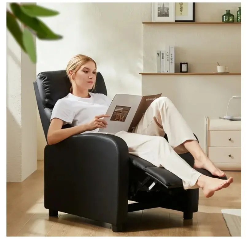 Experience unparalleled comfort and support with our ergonomic Recliner Chair, designed to contour to your body's natural shape and reduce pressure on your spine and joints for extended relaxation. Crafted from durable PU+PVC materials, this recliner sofa combines soft upholstery with a sturdy frame for long-lasting reliability. Maximize your living space with our compact yet spacious design, offering a full reclining feature without taking up excessive floor space. Easily adjust your chair to the perfect position for reading, watching TV, or napping with a simple recline mechanism. Enhance your home decor with the sleek and contemporary design of our Home Theater Seating, available in versatile color options to complement any interior style.