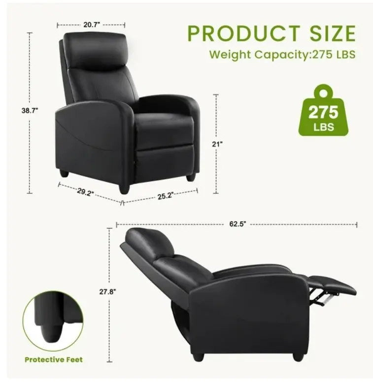 ·Space-Saving Design: Maximize your living space with the compact yet spacious Recliner Chair, offering a full reclining feature without taking up excessive floor space.