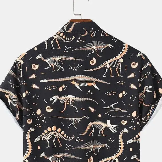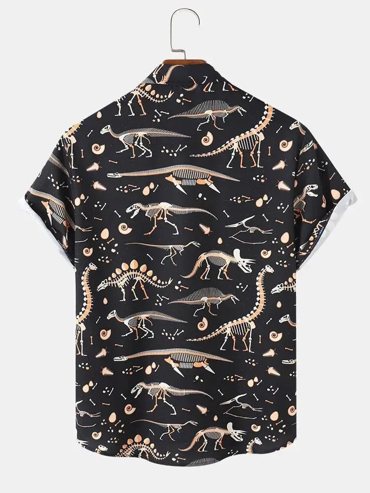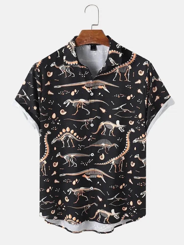Vintage Dinosaur Bones Hawaiian Shirt Menswear, Stylish Shortsleeve Button Aloha Top, Casual Classic Tropical Graphic Streetwear Polyester