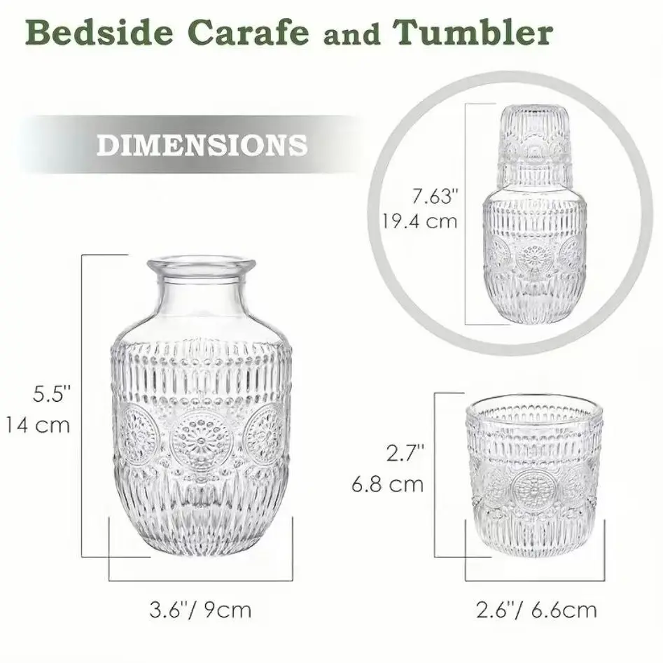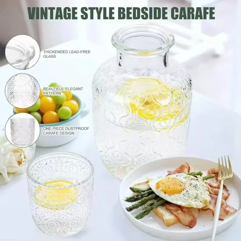 Premium Vintage Embossed Glass Bedside Carafe & Tumbler, Large Capacity Ins Style Thickened Explosion-Proof Pitcher with Dustproof Inverted Cup, Reusable Heat Resistant Stylish Drinkware Beverage Glassware for Home Living Room Hosting Office