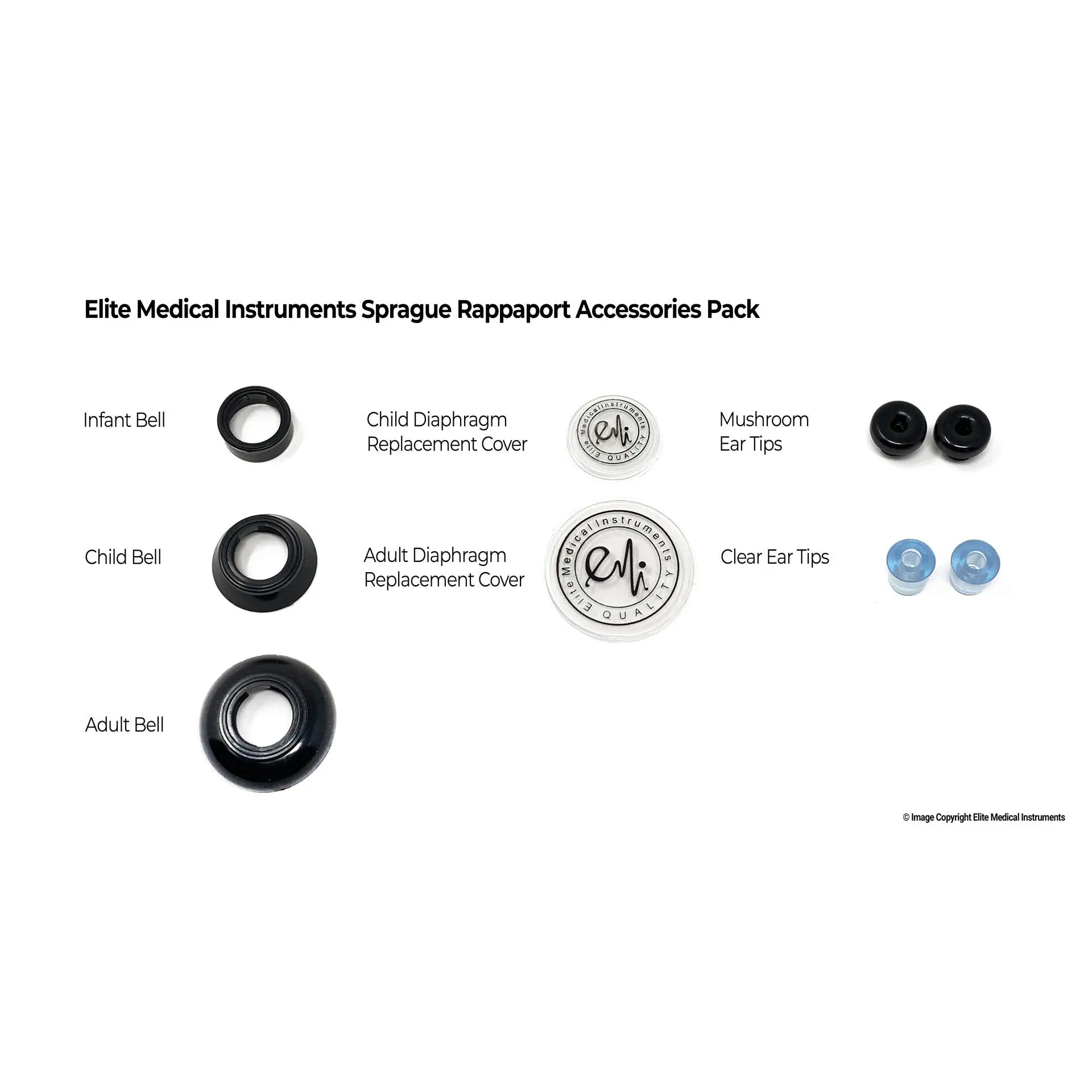 The Elite Medical Instruments Sprague Rappaport Stethoscope is five stethoscopes in one for a full range of diagnostic applications. As the most versatile model on the market, this classic design allows healthcare professionals to assess adult and pediatric patients using just one stethoscope. An ergonomic design ensures comfort for the doctor and patient, even during extended use. The Sprague Rappaport stethoscope is the most popular stethoscope type used by healthcare professionals today, providing clear sound transmission and robust features. The dual tubing create improved acoustic separation. Tubing length is 22 inches and total stethoscope length is 30". Features a fully rotating twin head drum and a name tag. The included accessory kit, the adult and pediatric diaphragm assemblies can be removed and replaced with adult, pediatric, and infant bells.