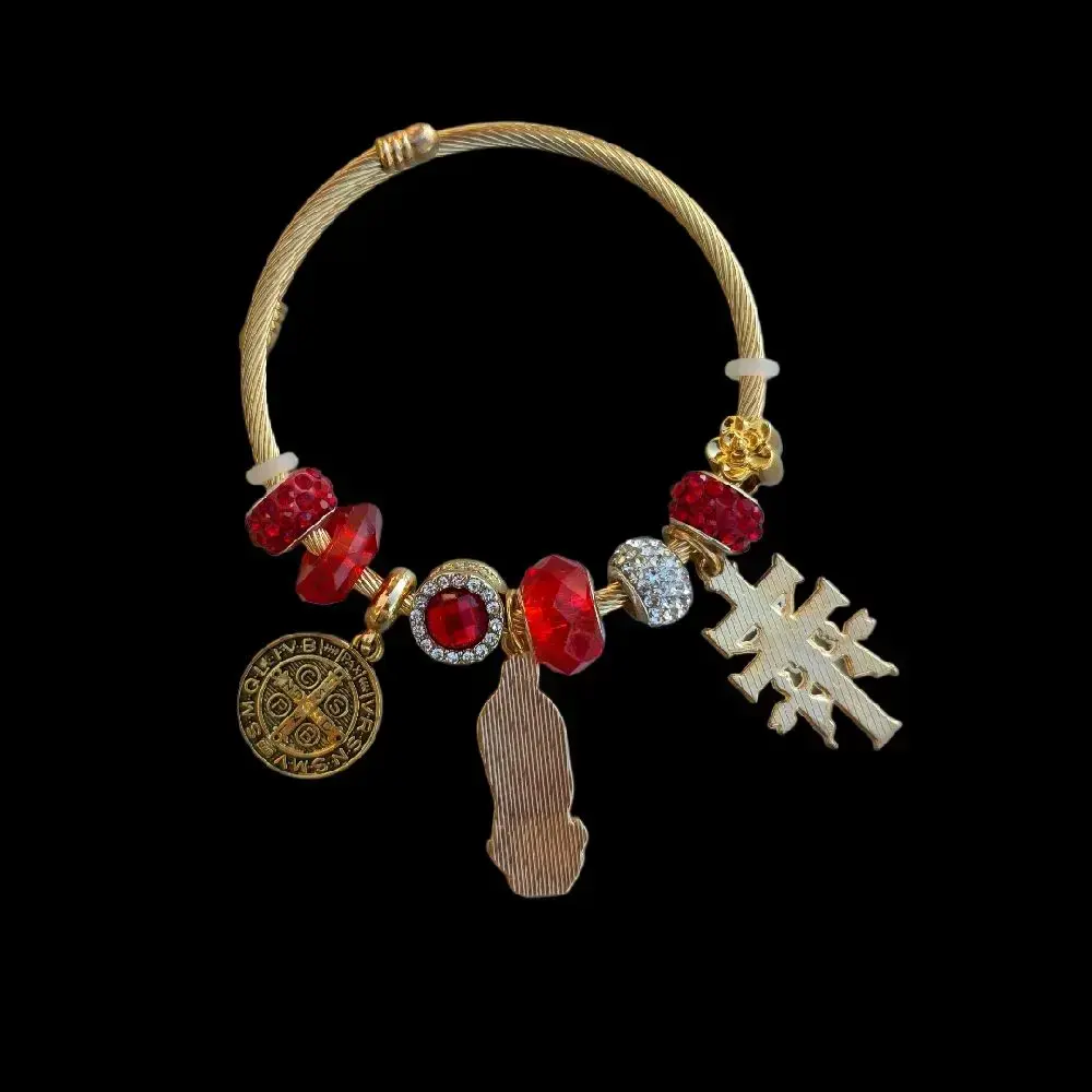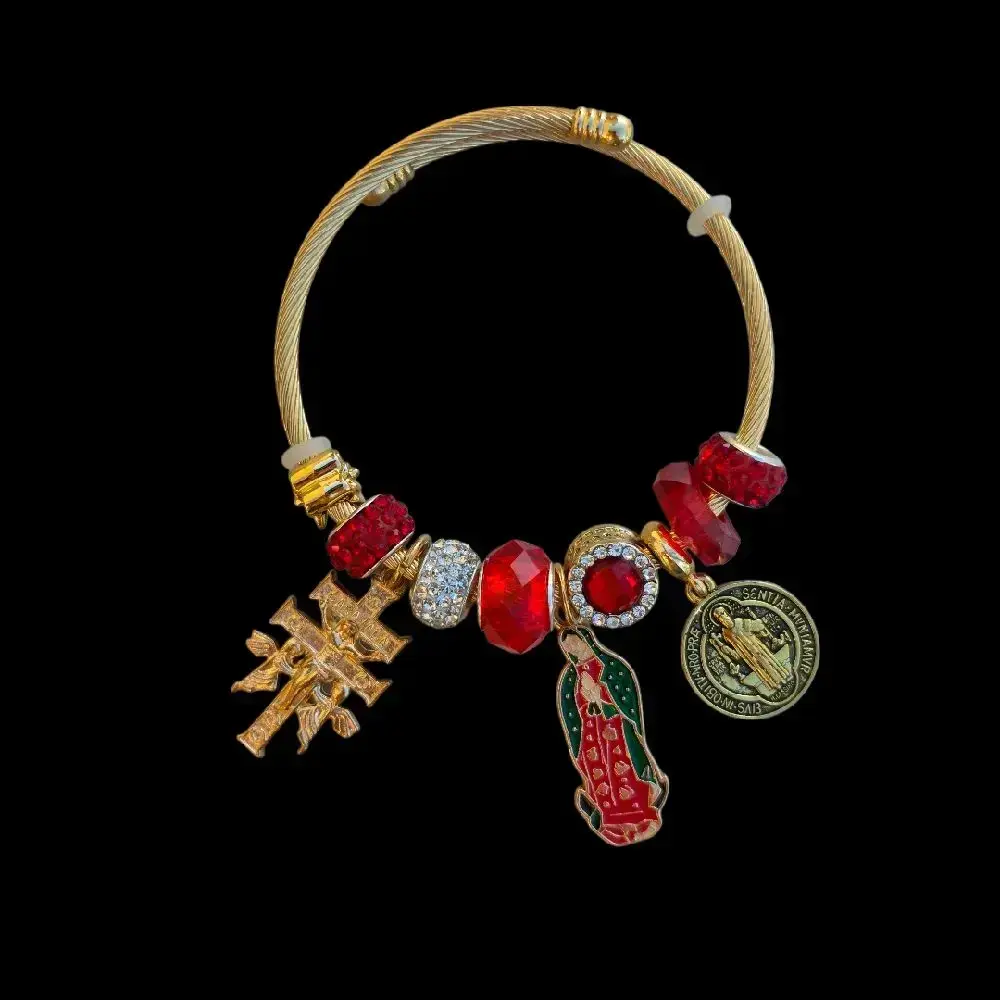 Red, San Benito, Virgen de Guadalupe y Cruz de Caravaca gold plated bracelet expandible