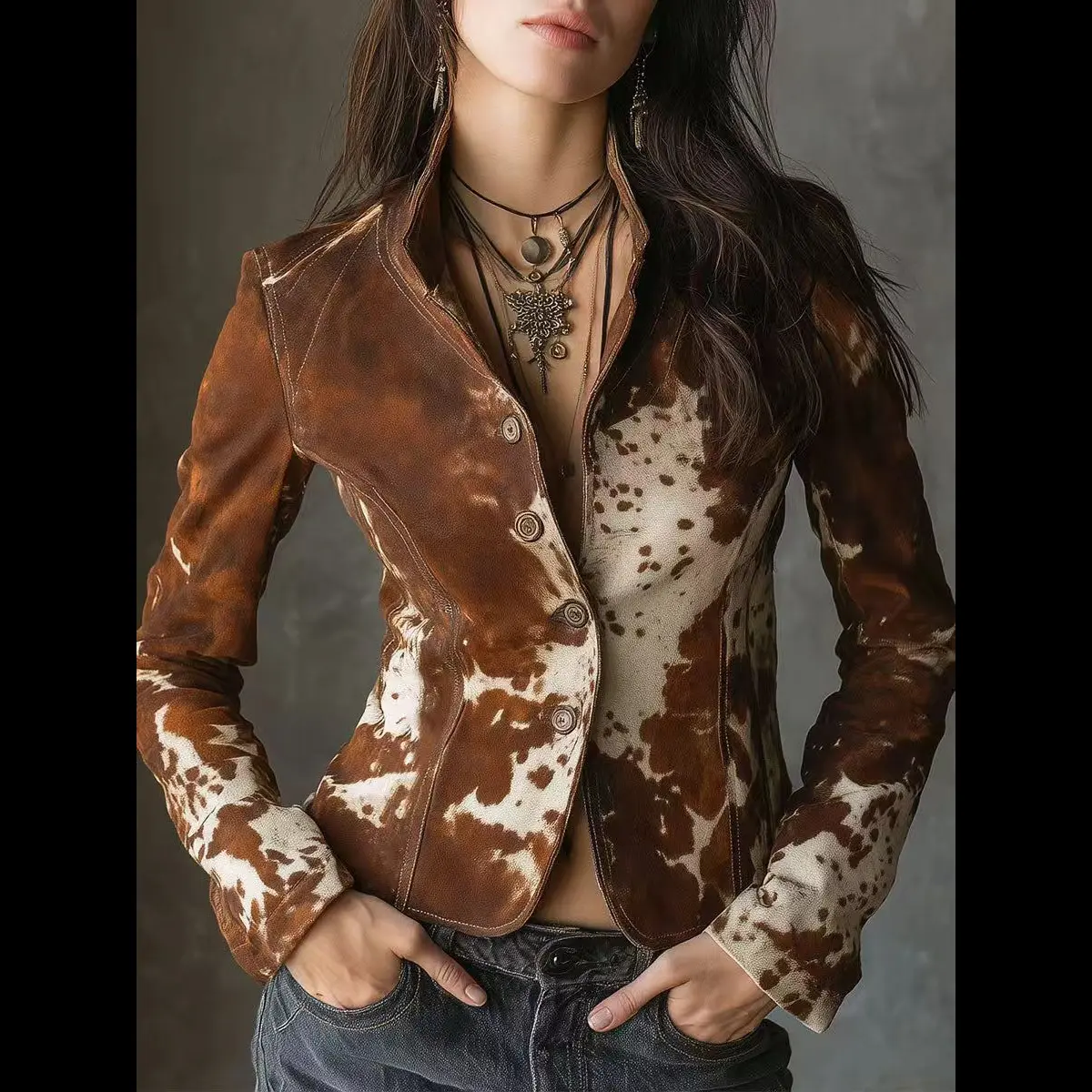 ?? Vintage Cow Skin Print Suede Blazer Make a bold fashion statement with this eco-friendly suede blazer featuring a striking cow print design. Crafted from sustainable materials, this blazer blends vintage western style with modern sophistication. ?? Features: How to Style: Pair with a black turtleneck or crisp white shirt. Style with denim jeans and western boots for a cowgirl jacket vibe. Dress it up with heels and silver jewelry for a chic evening look. Add a leather belt for a retro western touch. ?? Why You??ll Love It: This blazer is stylish, responsible, and versatile. It is best for cowhide blazer collectors and cow print jacket lovers. Perfect for sustainable clothing enthusiasts and those who enjoy western jacket styling or cowgirl fashion outfits. ?? Summary: The Vintage Cow Skin Printed Eco-Friendly Suede Blazer is perfect for fashion-forward individuals who value sustainability. With its bold cowhide print and eco-conscious material, it??s a standout piece that lets you look stylish while supporting a greener future. ??