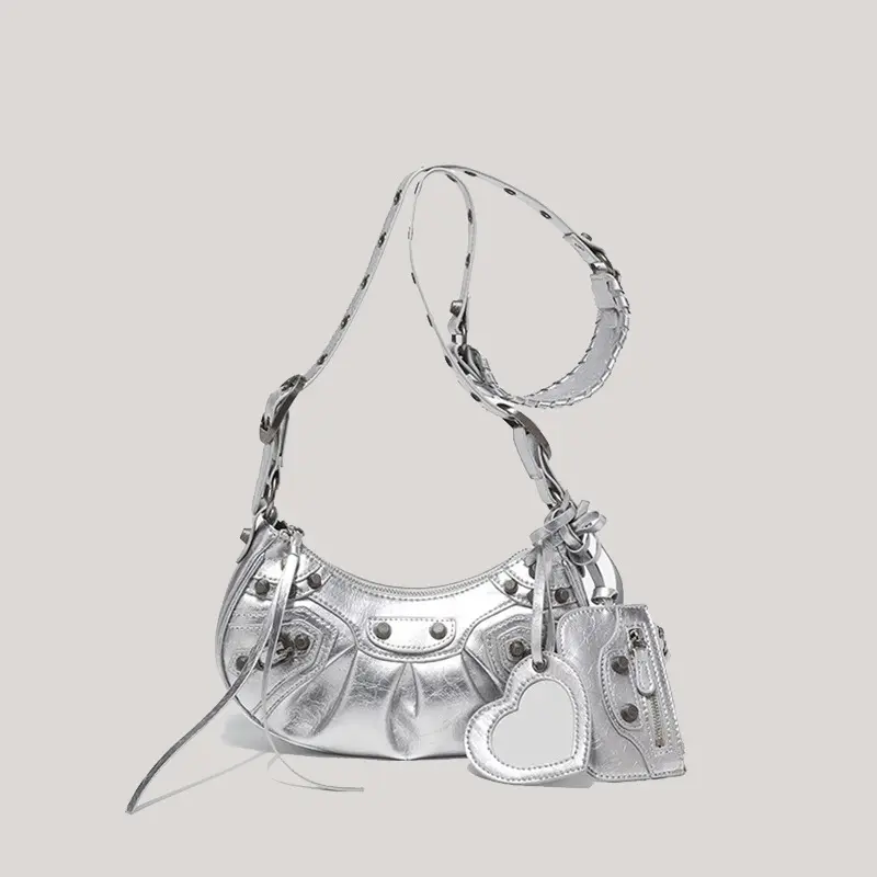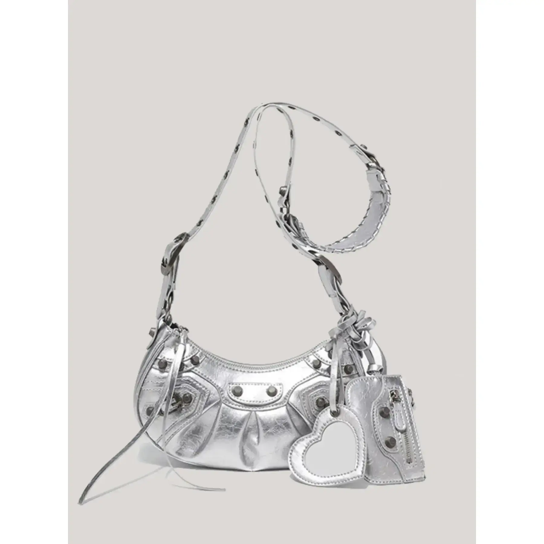 【Punk-inspired】: Features a unique punk style with rivets and a half-moon shape, standing out in the accessory category. 【Multiple Carry Options】: Designed for flexibility, it can be carried as a shoulder bag or underarm bag, catering to various needs. 【Additional Accessories】: Includes a small wallet and a heart-shaped mirror, enhancing usability and adding an extra touch to the bag. 【Plain Pattern】: The simple plain pattern complements various outfits, allowing for easy integration into your wardrobe. 【Year-round Use】: Suitable for all seasons, this bag maintains functionality and relevance throughout the year.