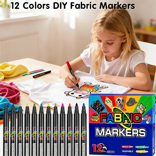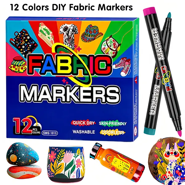 Fabric Markers Permanent for Clothes 12 Colors Dual Tip with Fine and Chisel Tips Paint Pens for Clothing Canvas Tote Bags T Shirt and Shoes Vibrant Colors Glitter Effect Non-Wooden Material Easy to Use