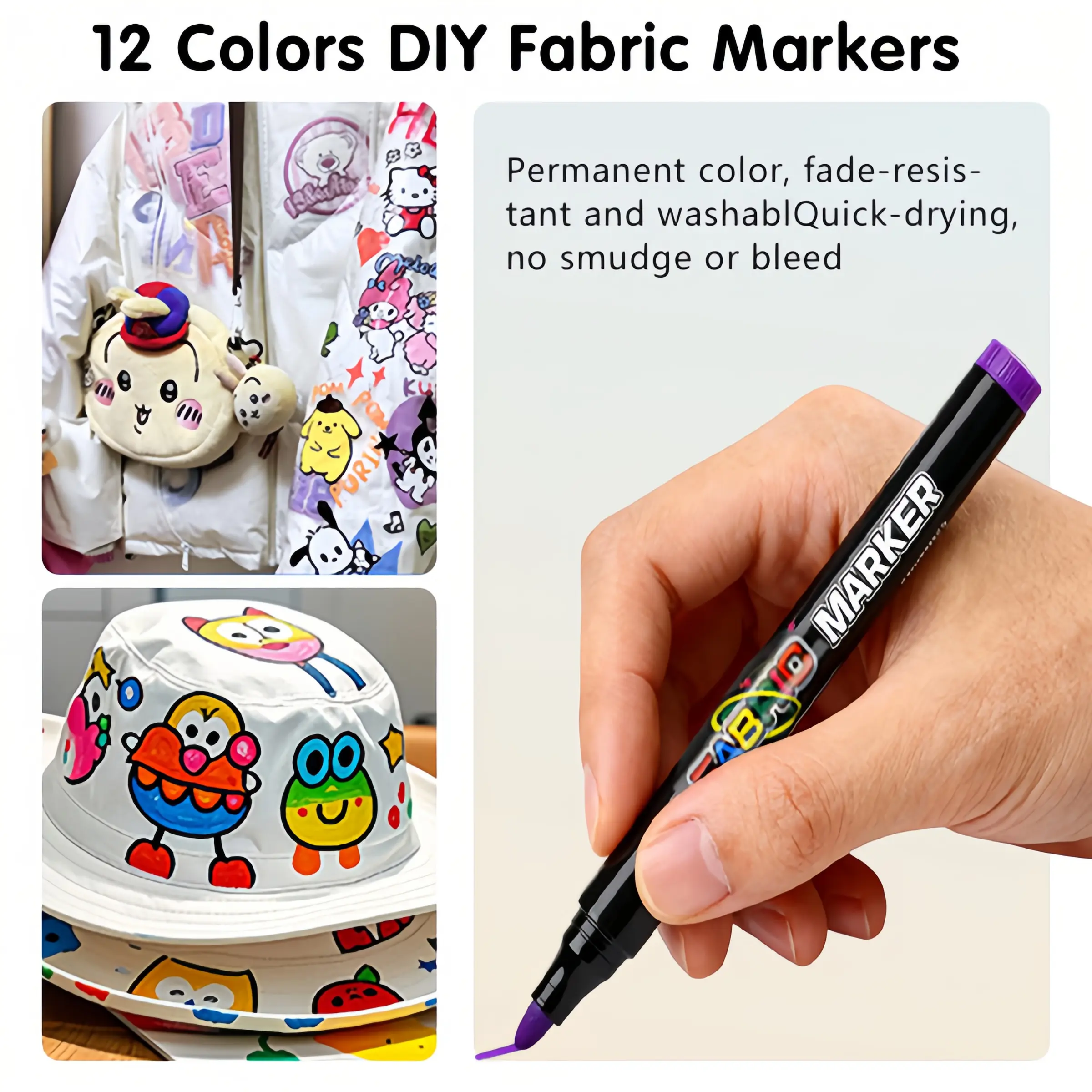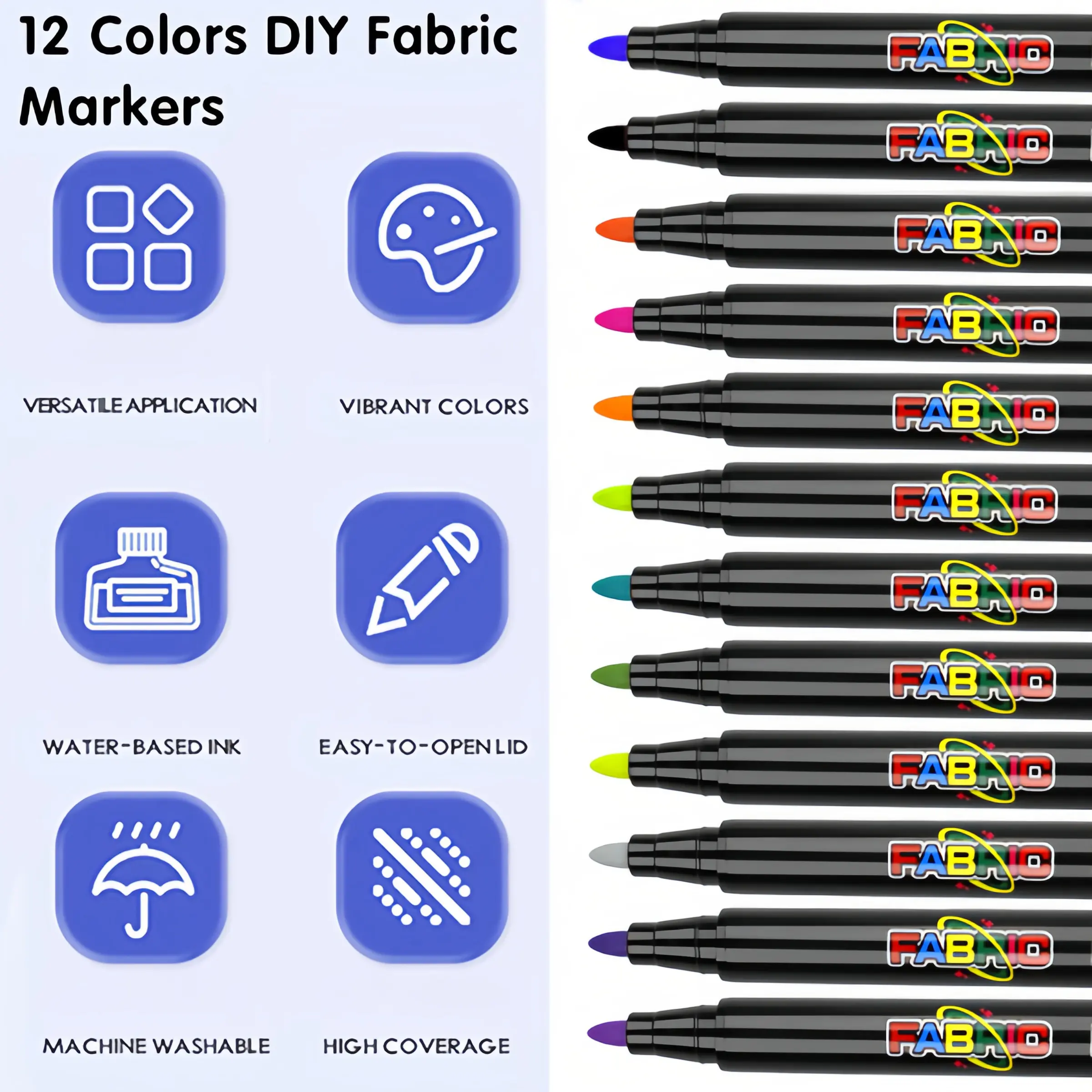 FABRIC PENS, INTENSE COLORS - Our set contains 12 different textile permanent markers with fabric offering you an amazing burst of shades, allowing you to unleash your creativity and add your personal touch