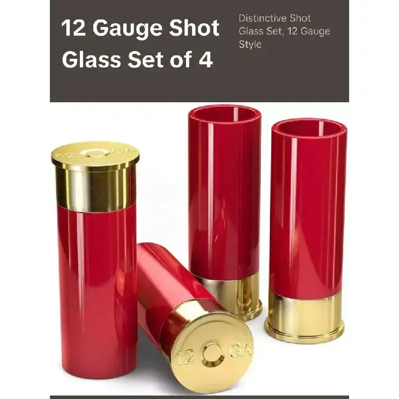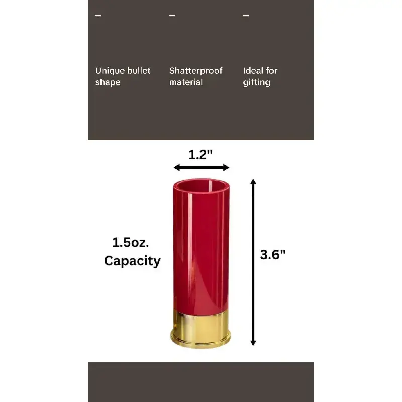 Elevate your barware with this unique set of 12 Gauge Shotgun Shot Glasses.Crafted from durable polyethylene, these shot glasses are designed to resemble authentic shotgun shells, adding a touch of charm to your drinking experience. Set of 4: This set includes four 1.5 oz shot glasses perfect for entertaining guests or enjoying a drink with friends. Unique Design: Each shot glass is shaped like a 12 gauge shotgun shell, making it a conversation starter at any gathering. Durable Material: Made from polyethylene, these shot glasses are shatterproof and reusable for long-lasting use. Ideal for various occasions such as groomsmen gifts, Christmas celebrations, Father's Day surprises, birthdays or simply enhancing your dining experience. The classic red and gold color combination adds an authentic touch to these shot glasses that are sure to stand out in any setting.