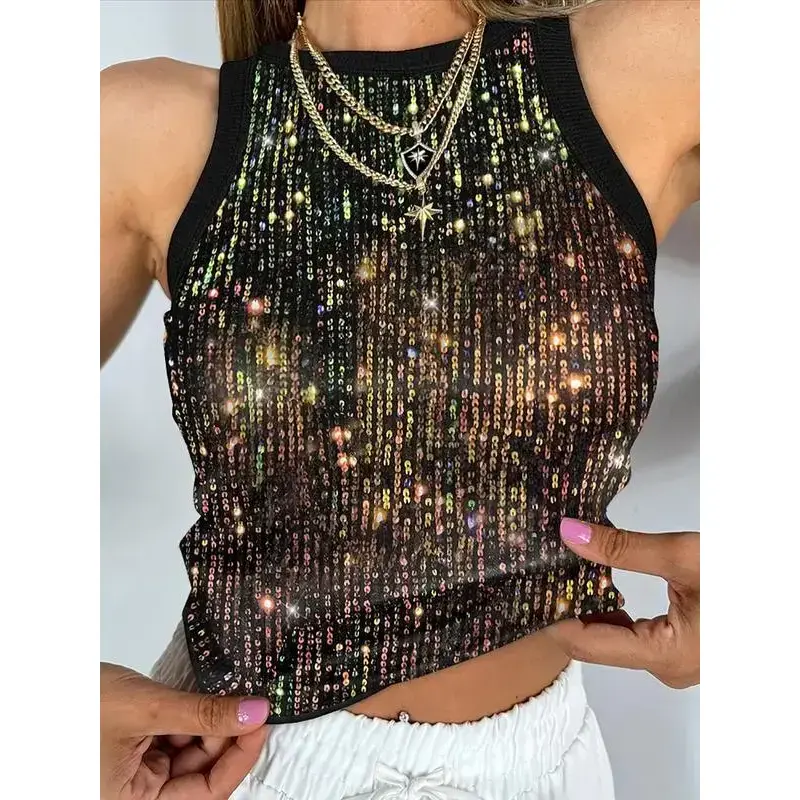 Style: Casual,Chic Type: Tank Neckline: O-neck Sleeve Style: Sleeveless Length: Regular Pattern Type: Camouflage Decoration: Allover Sequin,Contrast Binding Fit Type: Skinny Occasion: Daily Package Include: 1*Top Fabric Elasticity: Non-Stretch Sheer: No