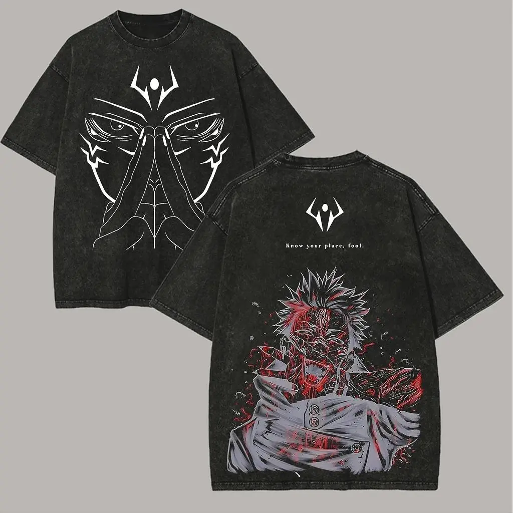 Dark Aesthetic Jujutsu Kaisen Sukuna Graphic T-Shirt, Vintage Washed Distressed Oversized Anime Tee, Trendy Japanese Manga Streetwear For Men, Epic Battle Art Top