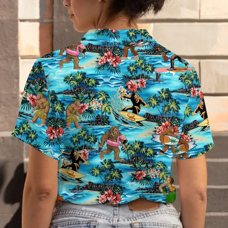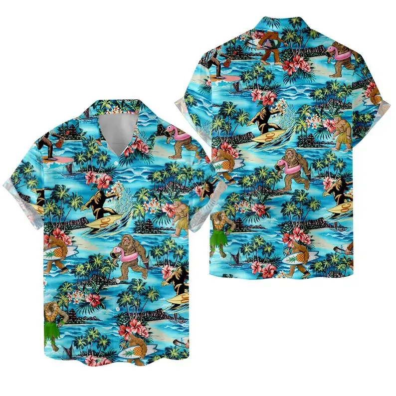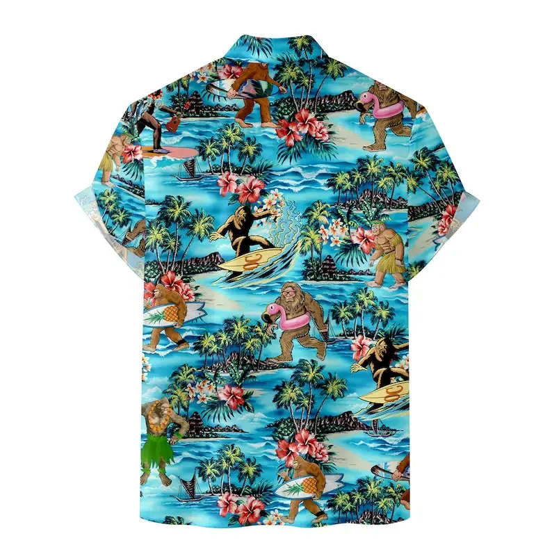 5. Bigfoot Hawaiian Shirt Classic Menswear, Sasquatch Button Collared Shortsleeve Aloha Top, Casual Graphic Stylish Tropical Streetwear Polyester