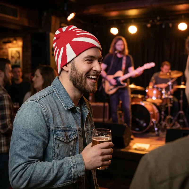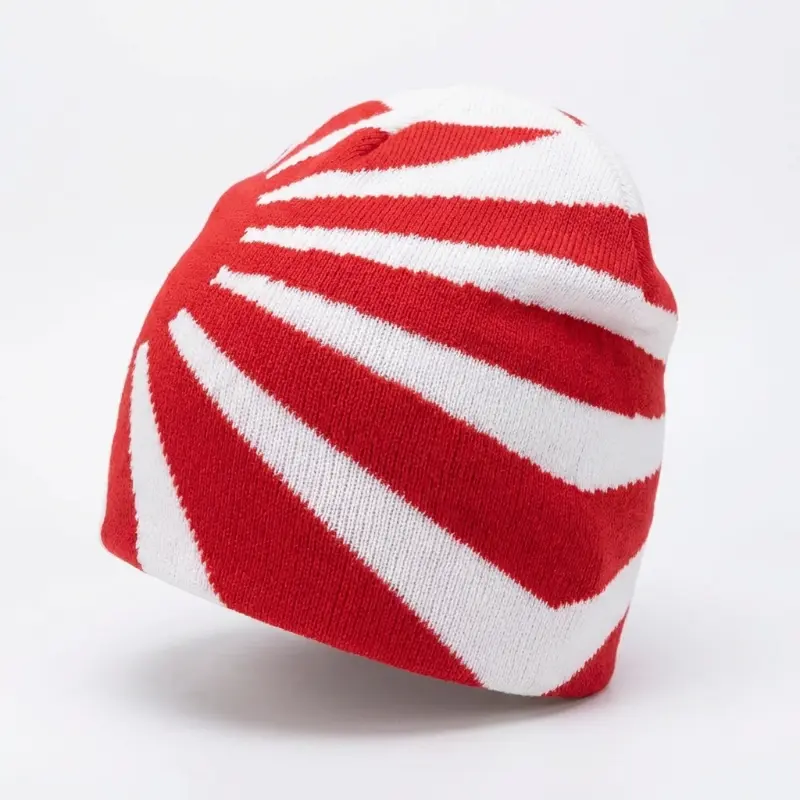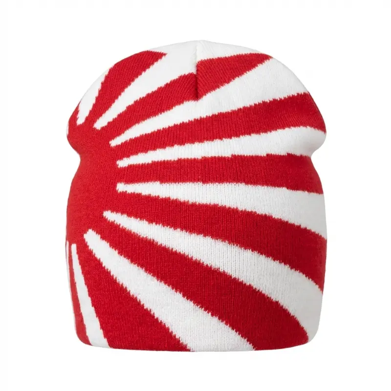 Details: • Soft knit fabric • One‑size‑fits‑most • Red base with white rising‑ray design • Lightweight but warm • Perfect for gifting
